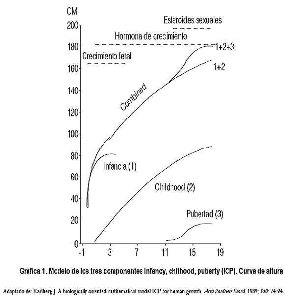 Karlberg11 propuso un modelo en el que intentaba sortear dichas limitaciones. Esto es el modelo ICP (infancy, childhood, puberty). En él, el autor consideraba que la curva de crecimiento habría de representar el efecto aditivo de varias fases biológicas. Según esto la curva podría descomponerse en tres partes: fetal y de la primera infancia, prepuberal o de la segunda infancia y un componente puberal. A continuación se describen cada uno de ellos.