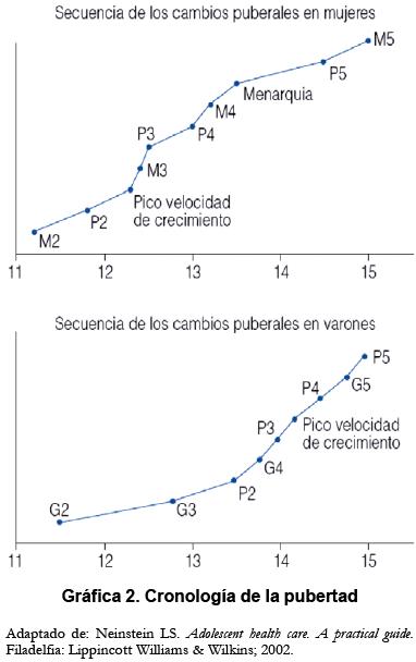 En las niñas, el inicio de la pubertad está marcado por la aparición del botón mamario y en los niños el aumento de volumen testicular, por lo general, superior a 4 cc. Ahora bien, la aparición aislada de vello pubiano no será un factor indicativo del inicio de la pubertad28. La cronología del desarrollo puberal se muestra en la Gráfica 2.Maduración esquelética o edad ósea. Entre los posibles indicadores para medir la edad fisiológica, uno de los más precisos es el grado de osificación. La zona anatómica más empleada es la mano (mano izquierda por consenso internacional) por las siguientes razones: su fácil accesibilidad, escasa radiación y la existencia de un amplio número de huesos en una pequeña zona corporal.