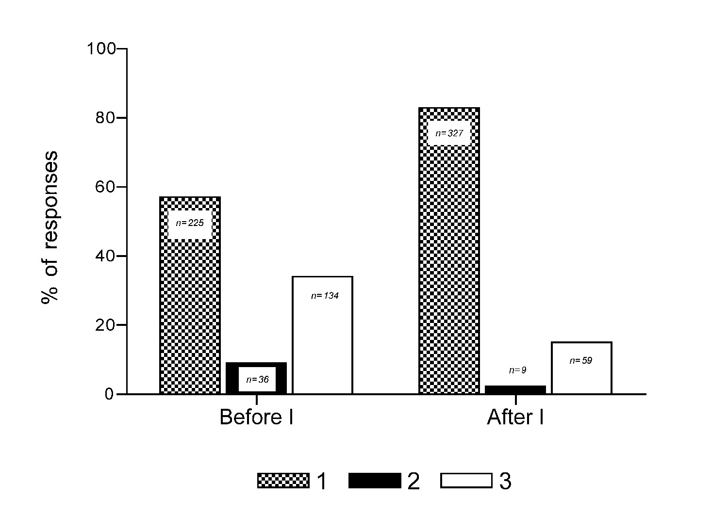 Among those in the sample, 43.2% were exposed to the intervention. Those exposed were selected at random from all of the participating municipalities and had a similar distribution by age and gender. The intention to donate organs in this sample changed significantly after the intervention: 74.24% of the people who declared that they would not donate and 55% of the people who were indecisive changed their opinion in favor of organ donation after the intervention (Fig. 1). The difference between the proportions of people with the intention to donate before and after the intervention was significant (p < 0.05).