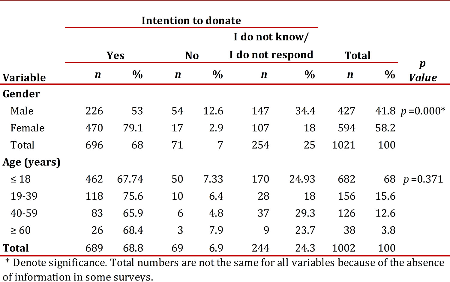 Regarding the intention to donate, the finding of this study (68.3% positive) is in accord with other research 18 ; however, it is lower than that reported by others 19 . In the analysis of the age groups, this study could not find differences regarding the intention to donate, which is in contrast with other research 18 , 20 . The greater intention to donate among women was remarkable. This finding, however, is consistent with a previous study involving a Spanish sample 9 .
