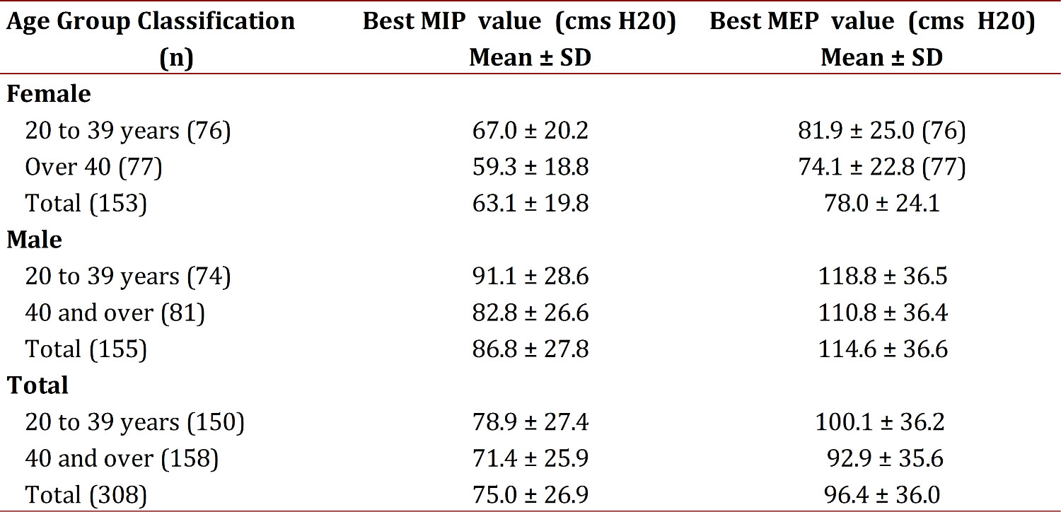 Similar studies in different Colombian regions are recommended to develop a predictive model for MIP and MEP from a multicenter study. This research demonstrated average MIP and MEP values in 2 main age groups (20-39, 40 and over). It is also recommended to extend the age range by 5-10 year periods which would allow the identification of differences between these groups and would also organize the sample in subgroups by BMI classification.