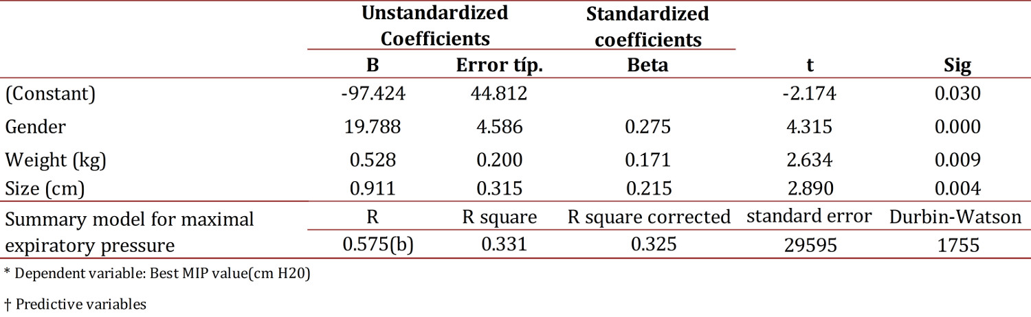 A multiple linear regression model was estimated in order to predict MIP and MEP values based on variables such as age, gender The highest coefficients of determination (r2) were taken for both MIP to MEP values; and the best model was tested for normality and homoscedasticity of waste, using the Kolmogorov-Smirnov and White tests respectively, it was also verified that the errors were normally distributed (K-S), equal to 0 and to be independent (Durbin Watson near 2). Finally, a multiple regression model was proposed to predict the dependence of the values obtained for maximal respiratory pressures respect to the independent variables with better r2 by a linear combination of the parameters used and the theoretical and practical formulation of the model obtained for values of maximum inspiratory and expiratory pressure was exposed.