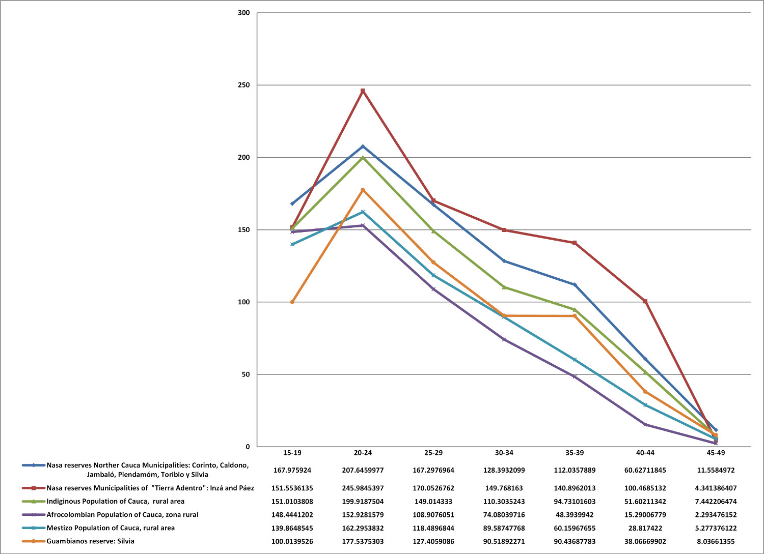 In contrast, among Guambiana women with the 2005 census there has been a collapse in the rates of early fertility (Fig. 1). Specific rates continue to lower in all five-year age groups when compared with hose among the Nasa women in Northern Cauca and Tierradentro areas. Similarly, they are lower than for all women among the indigenous groups in Cauca.In addition, specific rates appear to be very similar to those of the mestizo and Afro-Colombian rural populations of Cauca, but, unlike them, their teenage fertility rates would be the lowest (Fig. 1).