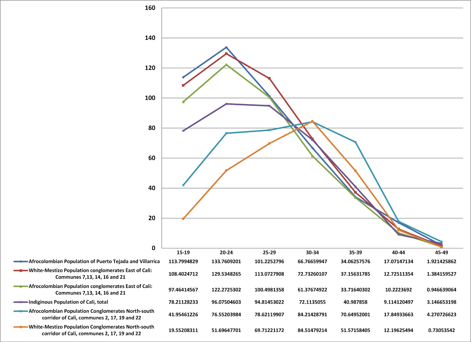 It is worth noting that the specific fertility rates for the Cali conglomerate of middle classes and upper classes, white-mestizo and black sare not only the most moderate, but the reproductive peak occurs in the 30-34 age group. This is a pattern similar to that found in core capitalist countries with the highest human development index(Fig. 2).On the other hand, the indigenous population in Cali, which is high lighted by the Nasa and Guambiano groups, has a lower fertility rate than that of the mestizo and Afro-Colombian populations in the Eastern Cali conglomerate and in the municipalities of PuertoTejada and Villarrica (Fig. 2). This is consistent with the selective urban migration pattern of other indigenous groups, as has been supported by the findings of other recent studies.