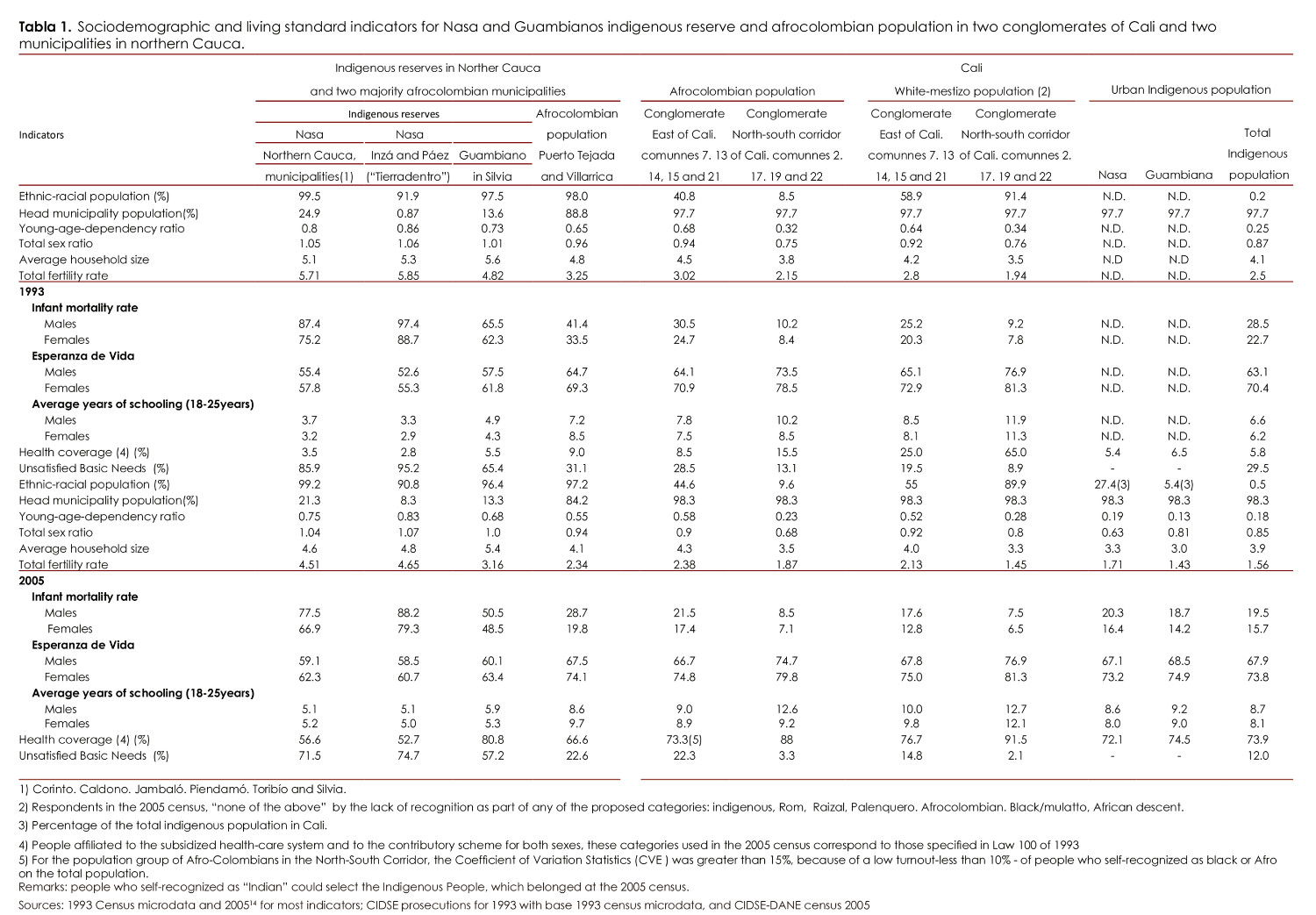 The study focuses on some key reservation areas - the municipalities of Caldono, Corinto, Jambaló, Piendamó, Toribio and Silvia- contrasting their situation with the two eastern municipalities of Cauca that are predominantly Nasa homelands, the regions of "Tierradentro" (Inzá and Paez) , and for the black population on the plains, encompassing the municipalities of Puerto Tejada and Villarrica. In turn, changes occurring in two urban clusters of Cali are analyzed, here referred to as the conglomerate Eastern Cali region (communities 7, 13 , 14, 15 and 21) and along the North-South corridor (communities 2, 17, 19 and 22) observing in both areas the changes in the black and white-mestizo populations. Thirdly, the aim is also to analyze the urban indigenous population (all Nasa and Guambiana populations) for the whole city of Cali.