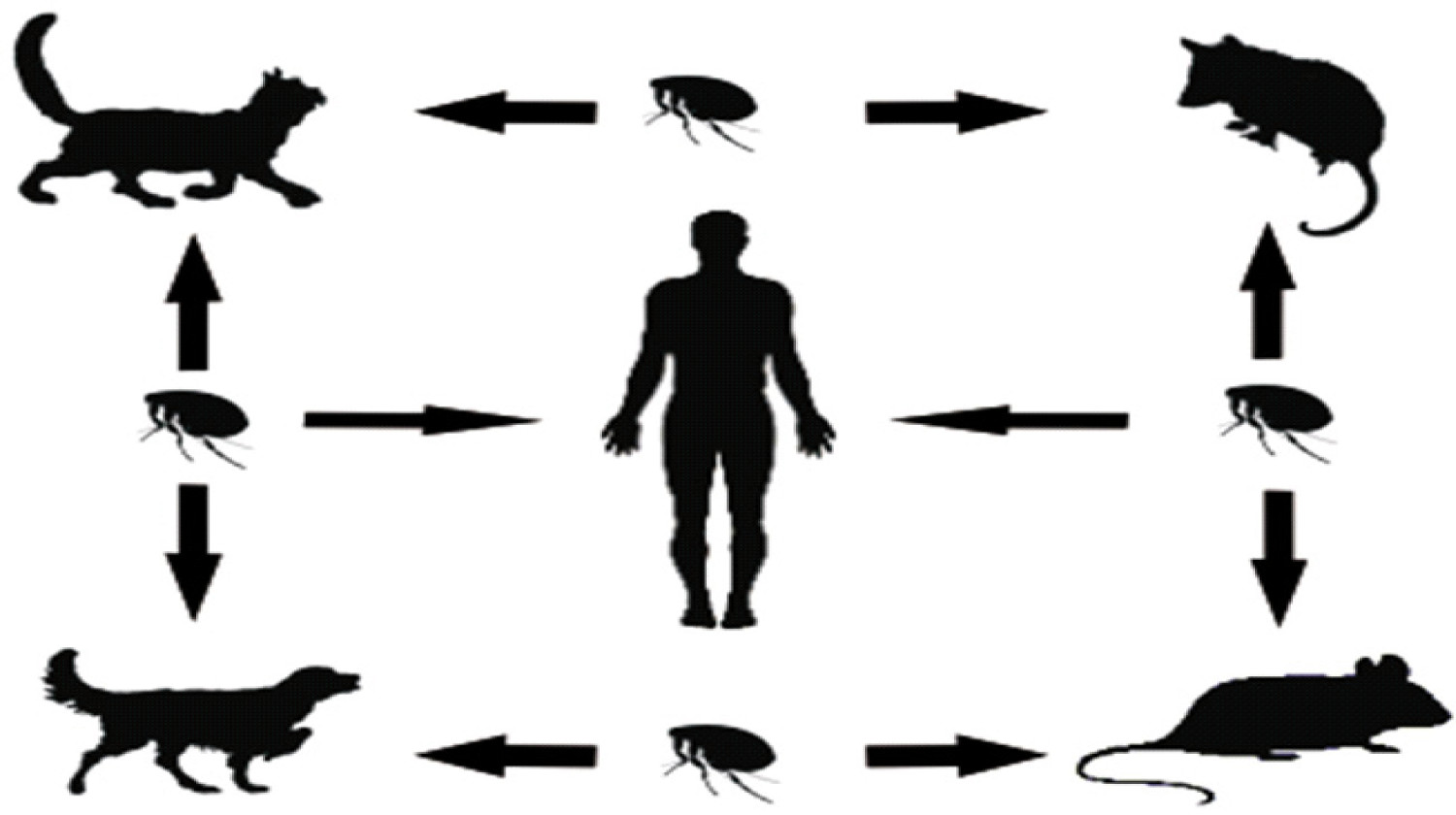 This cycle are composed by mammals host (rats and humans) and vectors (fleas). The classic natural cycle of this agent includes as a reservoirs two rats species (Rattus rattus and Rattus norvergicus) and the flea Xenopsilla cheopsis as a vector (Fig. 1). The fleas acquire the infection from rats with rickettsemia maintaining the infection during all his life but not killing the vector. Infection in humans are acquire in three different ways, being the most frequent way he self-inoculation from feces of fleas in the bite area and nails, this due to the presence of fleas in skin which produces itching that leads to the itching. Other transmission way includes bite and inhalation of flea infected feces when the hygienic conditions are inappropiated 4 . This classic cycle is still the main cause of endemic typhus in some regions in Greece and United States 5 . In other areas, murine typhus have other patterns not characterized. The main aspect is the presence of others reservoirs (i. e. cats, dogs or opossums), other vector and many others Rickettsia species 6 . In United States, contrary to the classic cycle rat-flea-rat, the most important reservoirs are opossums from the gender Dydelphis and cats¸ the cat flea, Ctenocephalides felis also have been identified as a vector 4 .
