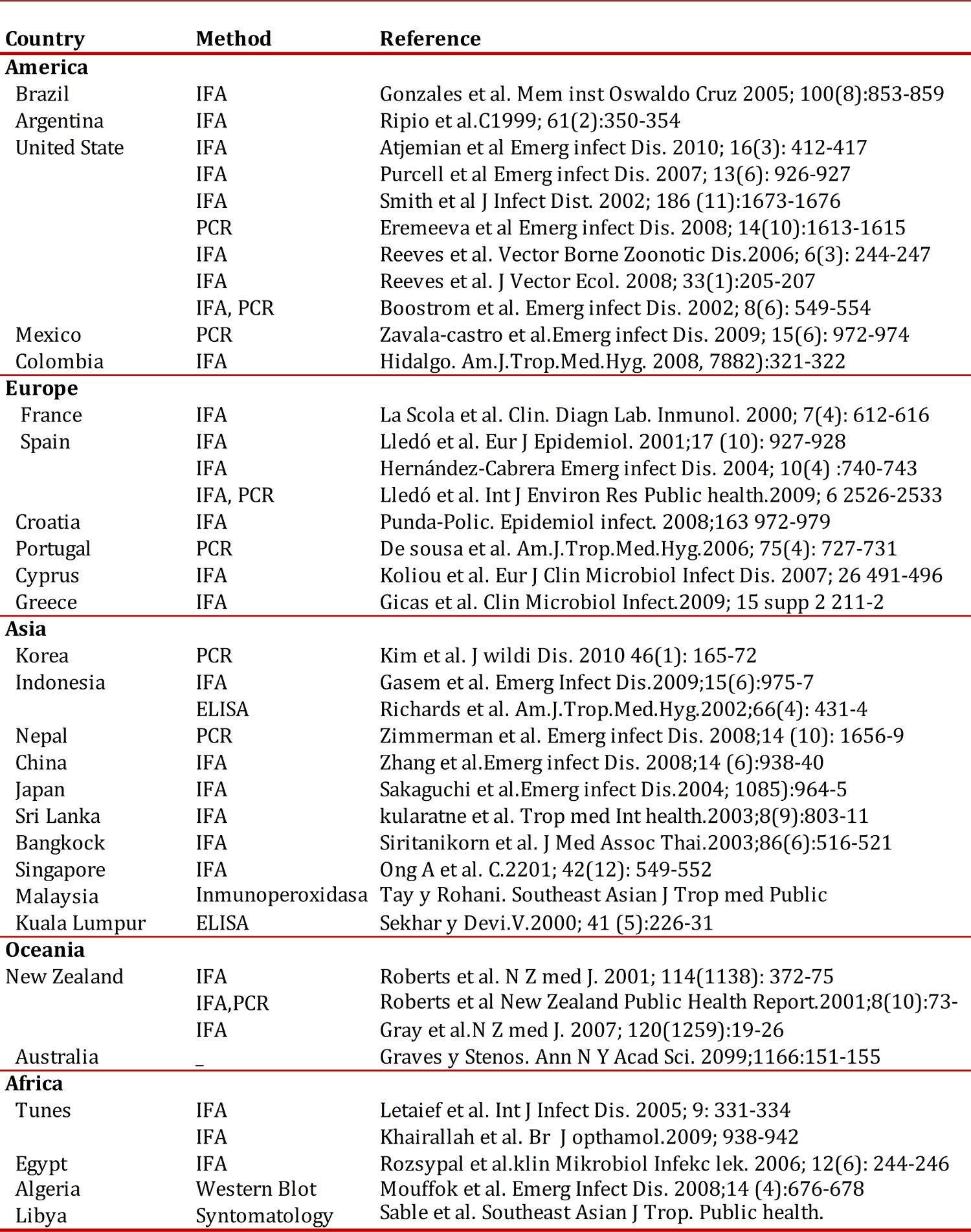 This disease is endemic in temperate climates and especially in coastal areas. In the United States, Asia, Australia, México and Spain (Table 1, Fig. 2). Also have been founded R. typhi infection in different species of wild mammals in different parts of the world which can include rodents (Rattus rattus, Rattus norvergicus), opossums (Dydelphis) and dogs as well as consider endemic typhus as a disease imported by travelers and refugees 20 . It has been shown by studies of incidence of this disease in different countries, which are seasonal, in which the majority of cases occurring in a year is higher during warm weather, while cold weather, infection is very low or almost zero. This disease occurs in all age groups and is relatively common in children. As regards distribution by sex, race and occupation of patient no significant differences, although people living in rural or disadvantaged areas are more prone to infection.