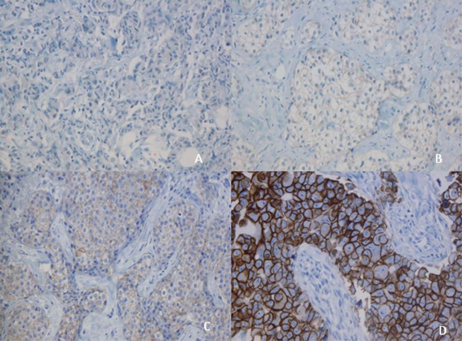 IHC is a method that evaluates the HER2 protein expression on the cell surface; a semi-quantitative scale has been used depending on the intensity of reactivity on the membrane and the number of cells observed at light microscopy in different categories (0, 1+, 2+ and 3+). The first two are considered negative, 2+ is considered ambiguous or indeterminate and 3+ is considered positive (Fig.1)