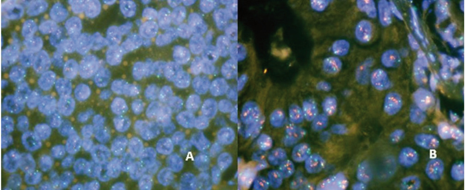 Conversely, the FISH methodology allows evaluation of the state of amplification of HER2, it has greater sensitivity and specificity, and it is based on the application of a DNA probe that hybridizes with HER2, as evidenced by a fluorescent signal. Since all cells contain the genes for HER2, and chromosome 17, it is possible to carry out a simultaneous evaluation process for the quality of nucleic acid preservation (internal tissue control). In cases where there is an amplification of the oncogene, an increase in the number of signals corresponding to HER2 is identified and an increase in relation to the signals of the gene and the centromeric signals of cromosome 17 14 (Fig. 2). This methodology requires a fluorescence microscope and additional equipment which makes it more expensive and therefore restricted to specialized laboratories.