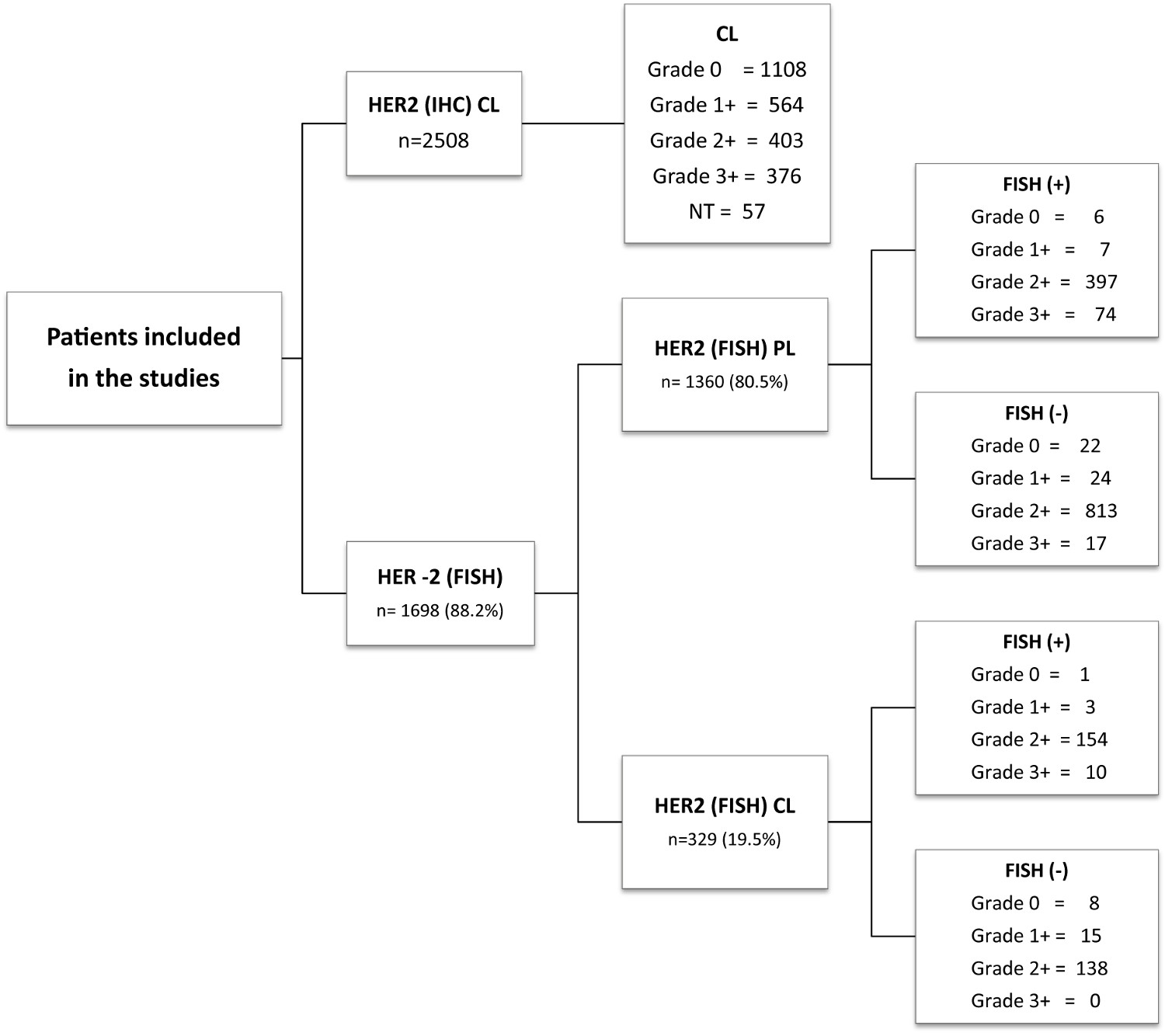 Distribution of cases in the study is shown in Figure 3. All samples were reviewed by two pathologists to confirm the diagnosis of invasive BC. The vast majority of cases referred by the PL correspond to samples in which the result of IHC was ambiguous (2+) and were sent to the CL for the confirmatory FISH study. For studies conducted at the CL, 4µm sections obtained from the paraffin blocks were mounted on electrically charged plates and analyzed by IHC using the Herceptest methodology (Dako K5204) following the manufacturer's instructions. The interpretation of the results was performed following the guidelines recommended by ASCO/CAP 11 , 12 .