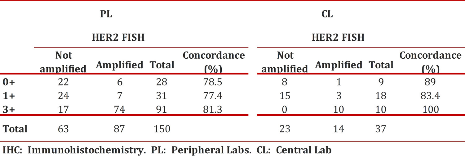 In this study, unlike ours, there was no study of concordance between IHC studies performed in the PL and FISH studies performed in the CL, although they noted that the consulting CL had acquired a global concordance percentage of 98.4% with the FISH studies. The latter finding had a false negative rate of 1% for cases rated 0, and 2.7% for the cases rated 1+, along with a percentage of false positives of 1.5% for the cases rated as 3+.