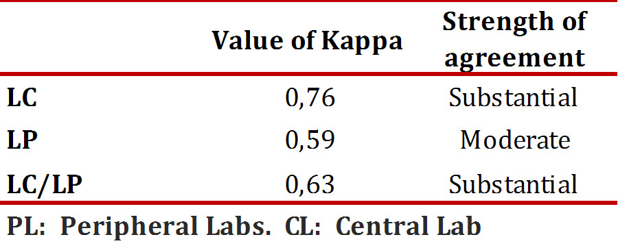 Taking these factors into account, it is expected that a high level of agreement exists between the results obtained with these two methods; it is estimated that this value must be greater than 95%. According to recent studies, this percentage of agreement is usually only obtained in central reference laboratories (CL) in which a large number of samples are analyzed. On the other hand, there are relatively few studies from differing countries that have assessed the level of concordance between peripheral laboratories (PL) and CL. In addition, we do not know of a systematic study being done with regard to this 15 - 19 .