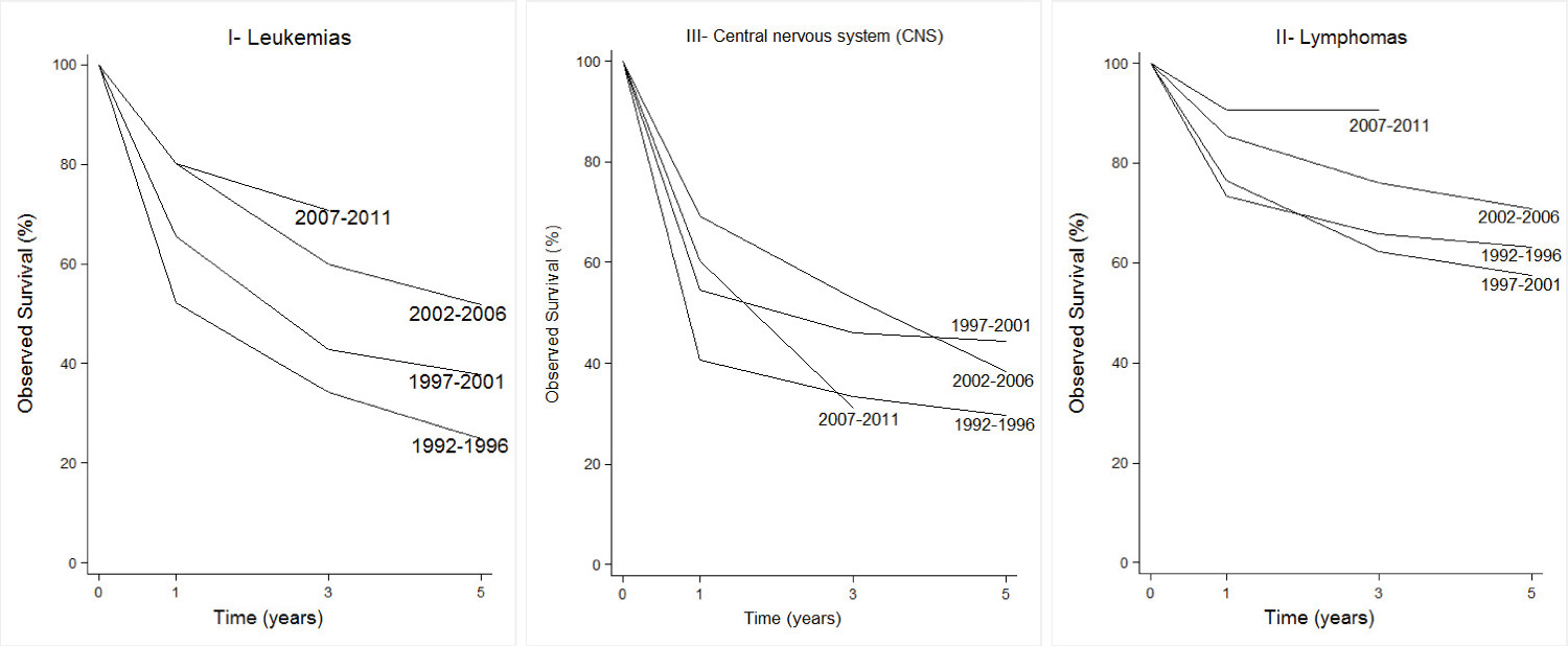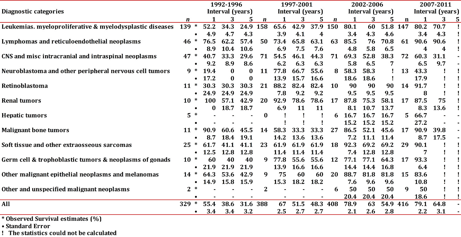 The outcome variable was the death of the child. To do the analyses of survival, it was necessary to determine the time contributed by each study subject. For this estimate, we used the date of diagnosis and the date of death. If we identified a subject as alive at the end of the study period, we used that date to determine his survival time. When subject vital status at the end of the study period was unknown, we used the last contact date with vital status data. We decided to use as the date of initial observation January 1 1992, and as the completion date June 30 2012. Survival for each childhood cancer group was described in terms of 1-year, 3-years, 5-years and 10-years of observed survival. The observed survival and corresponding standard errors were computed via the life tables method in SEER*Stat. 17 Five-year observed survival was estimated for four quinquennial periods, (i.e. 1992-1996; 1997-2001; 2002-2006, 2007-2011). The patients who were alive at the end of the study or were lost to follow-up during the study were censored.