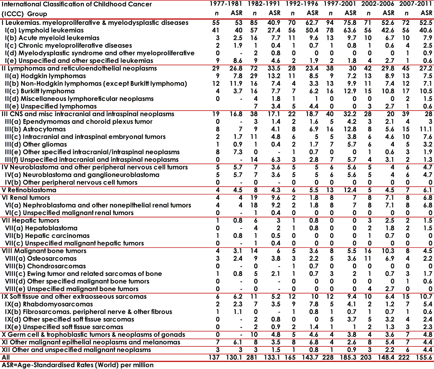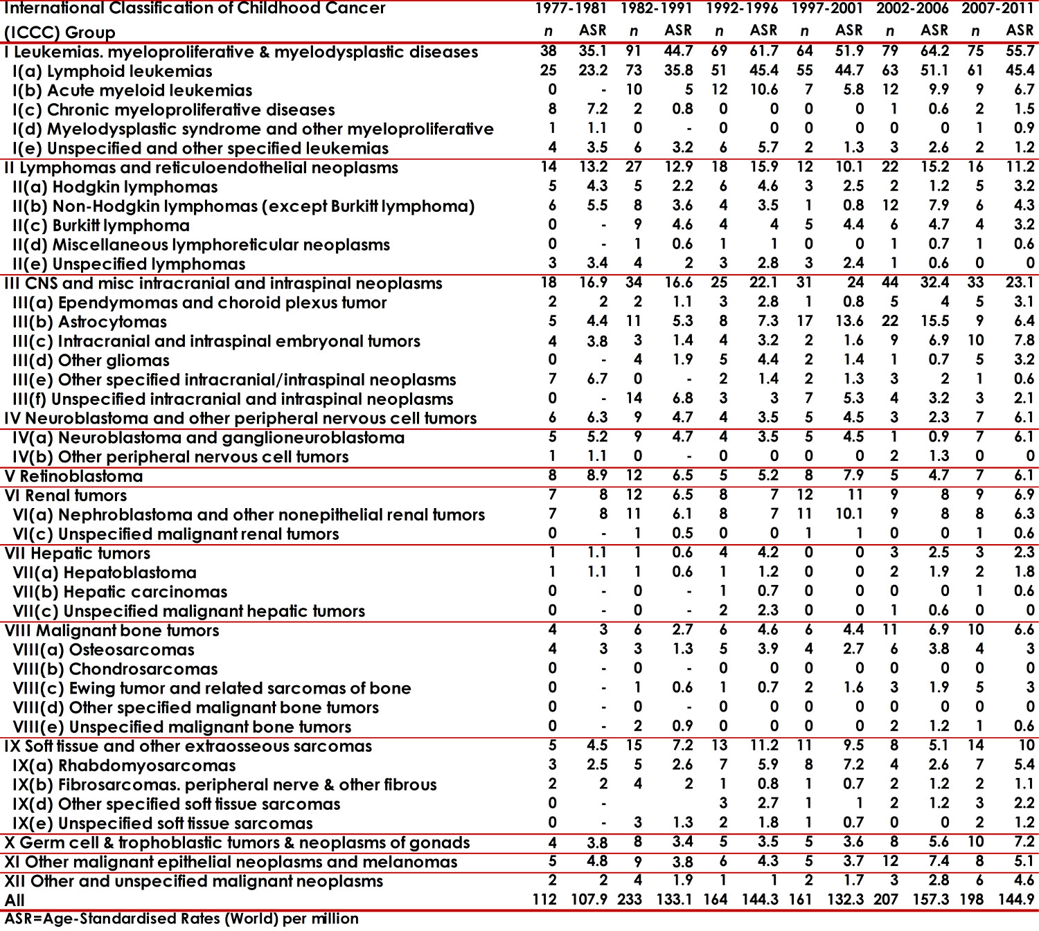 We selected as incident cases all children living in Cali from 1977 to 2011 with first malignant neoplasms diagnosed in each subject, with the exception of benign tumors of the CNS -that also were included. We used ICCC-3 classification for grouping. 11