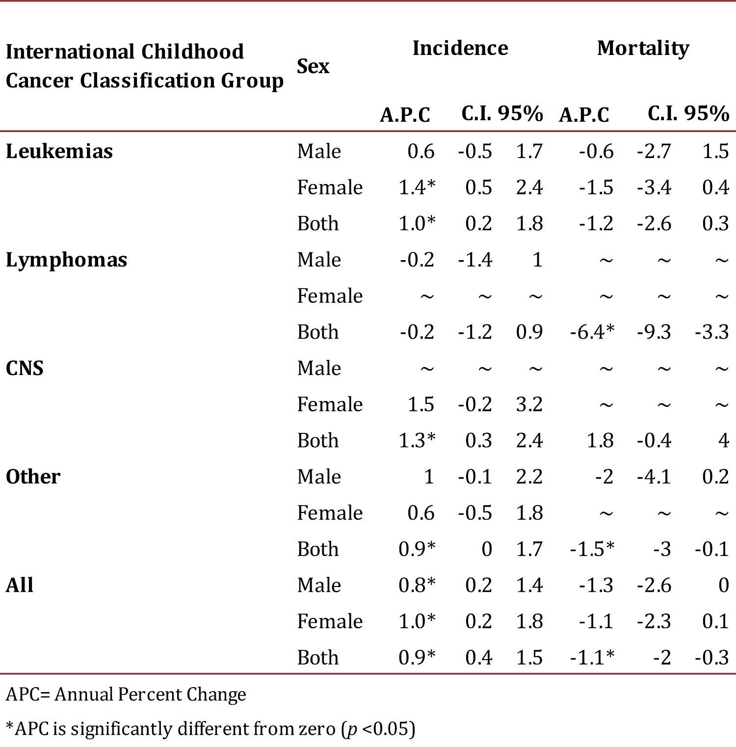 We estimated the annual average incidence and mortality rates per million people per year. We also determined age-specific rates according to the following groups: 0-4, 5-9, and 10-14 years. For the estimation of the global rate, we did an adjustment by age taking into account the world population structure as followed by Segi. The population denominators used for calculation of the incidence rate were estimated from the Colombian national population censuses (DANE). 18 Trends of rates were evaluated by the annual percentage change (APC), using the weighted least squeres method embedded in the US National Cancer Institute´s publicly accessible SEER*Stat software. 17 The APC represents the average percentage of annual increase or decrease in cancer rates adjusted by age, assuming a constant rate of change for the incidence or mortality rates over the evalution period. For this, we assumed a constant rate of change for the incidence or mortality rate during the interval of time evaluated. We examined this tendency in cancer incidence using Poisson regression. This modeled the natural logarithm annual rates for age groups, as a function of the year of diagnosis. From the corresponding regression coefficient of these models, we derived the APC and its 95% confidence interval. 17