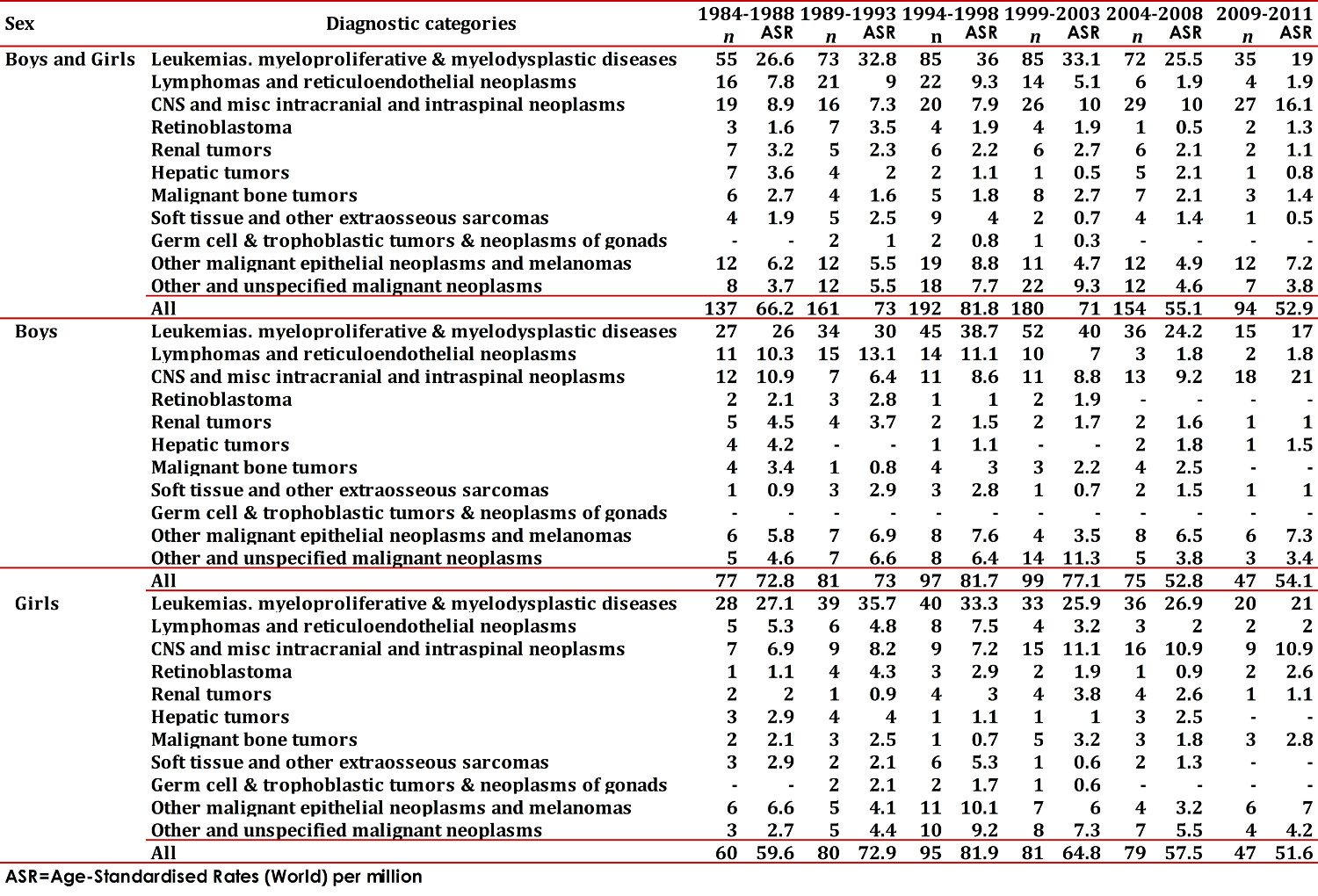 The distribution of neoplasm's, according to the ICCC-3, is presented in Tables 1 and 2. Most of the cases (69.6%) concentrated on the first three main diagnosis groups: leukemias (group I 37.3%), lymphomas (group II 15.4%) and CNS tumors (group III 16.3%). It is necessary to note that Neuroblastoma represented 2.8% and Retinoblastoma 3.7%. The IR was 141.2 for all the diagnostic groups. The IR values oscillated according to periods (5-year periods) and sex from 130.1 to 185.3 in boys; and 107.9 to 157.3 in girls. The age-specific rates (ASR) per group and diagnostic subgroup, sex and five-year period are presented in Tables 1 and 2.