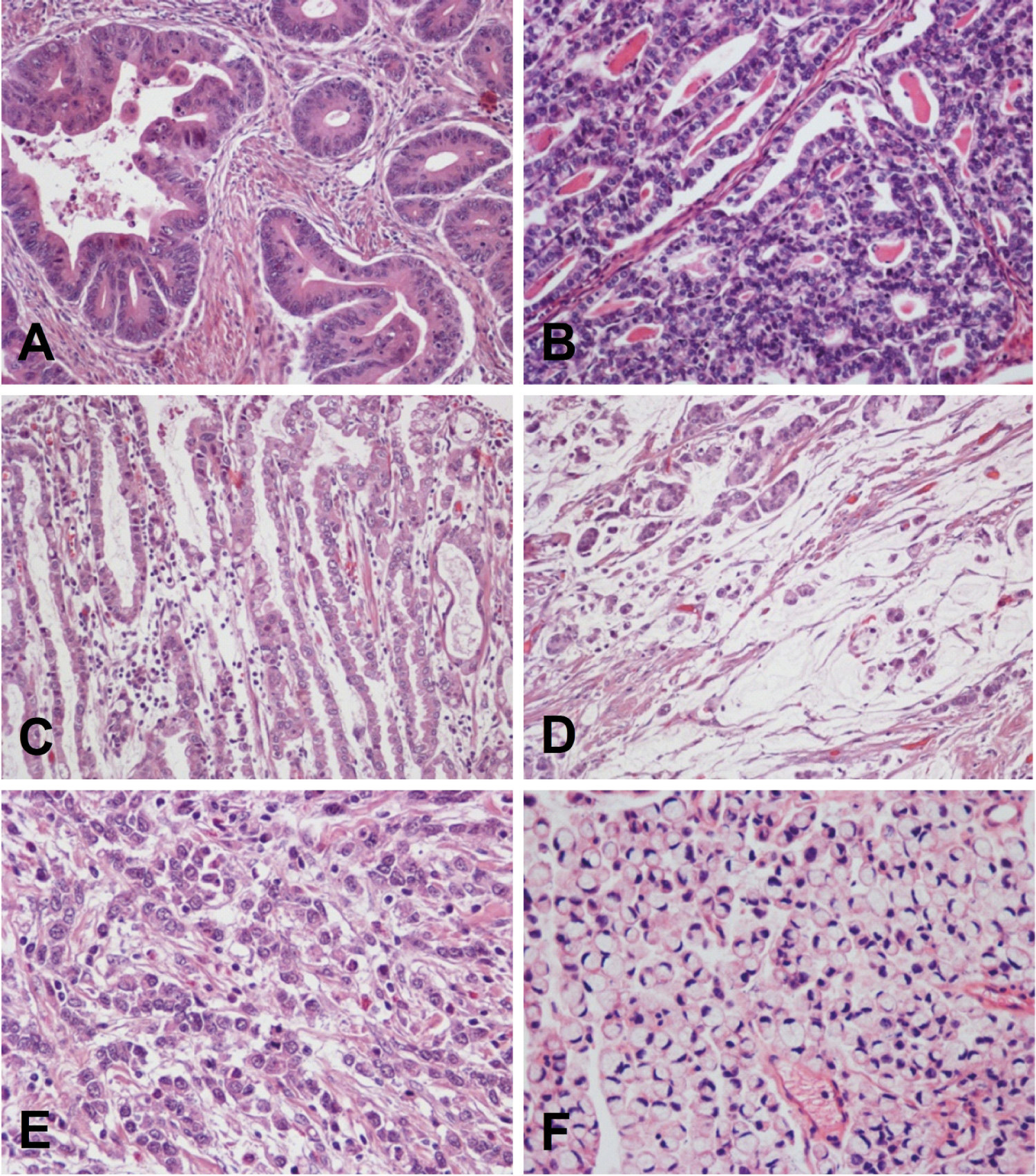 Mucinous (colloid) adenocarcinomas may originate in adenocarcinomas of either intestinal or diffuse types 42 . These tumors are composed of malignant epithelial cells floating loose or in small groups in large mucinous areas (Fig. 3D); in some cases, signet ring cells may be observed. By definition, the extracellular mucinous pools constitute at least 50% of the tumor 1 .