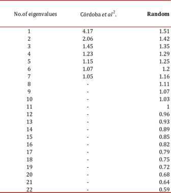 A more accurate method which has gained a scientific consensus for good practices for retaining the number of factors is called parallel analysis 3 , 4 . This procedure is based on the work of Horn 4 , which consists of randomly creating the same number of variables as the number of items analyzed (in the case of MBI-HSS, 22 items),correlating them and extracting eigenvalues against which the eigenvalues derived from the empirical data under analysis are compared. This procedure was applied to the eigenvalues reported by Cordoba et al. 2 , in Table 2 by means of the Monte Carlo PCA 5 program (100 replications). Our results are shown in (Table 1).