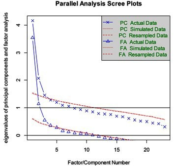 The appropriate number of factors to retain is achieved by making a one to one comparisons of the eigenvalues, keeping the empirical eigenvalue that is less than the random eigenvalue. Conceptually, this indicates that the significant eigenvalues must be greater than those generated randomly. In Table 1, the number of eigenvalues to retain is 3, which is exactly the same number of factors underlying the MBI-HSS. Validating the result with a conceptual analysis of these three factors, would leave one to conclude that the factorial structure of the MBI-HSS is replicable in the sample studied. Compared with the first result of the authors (7 factors), the methodological difference is clear. Finally, we note that the use of parallel analysis should be recommended for making more accurate decisions about the number of factors to retain.
