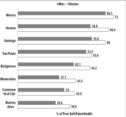Figure 1 shows the prevalence of poor self-rated health by gender in Commune 18 of Cali and across other cities in Latin America. Commune 18 of Cali had lower prevalence of poor SRH in both older men and women than those in Bridgetown, Sao Paulo, Santiago, Havana and Mexico City, but higher prevalence than that in Buenos Aires (men and women) and Montevideo (men).