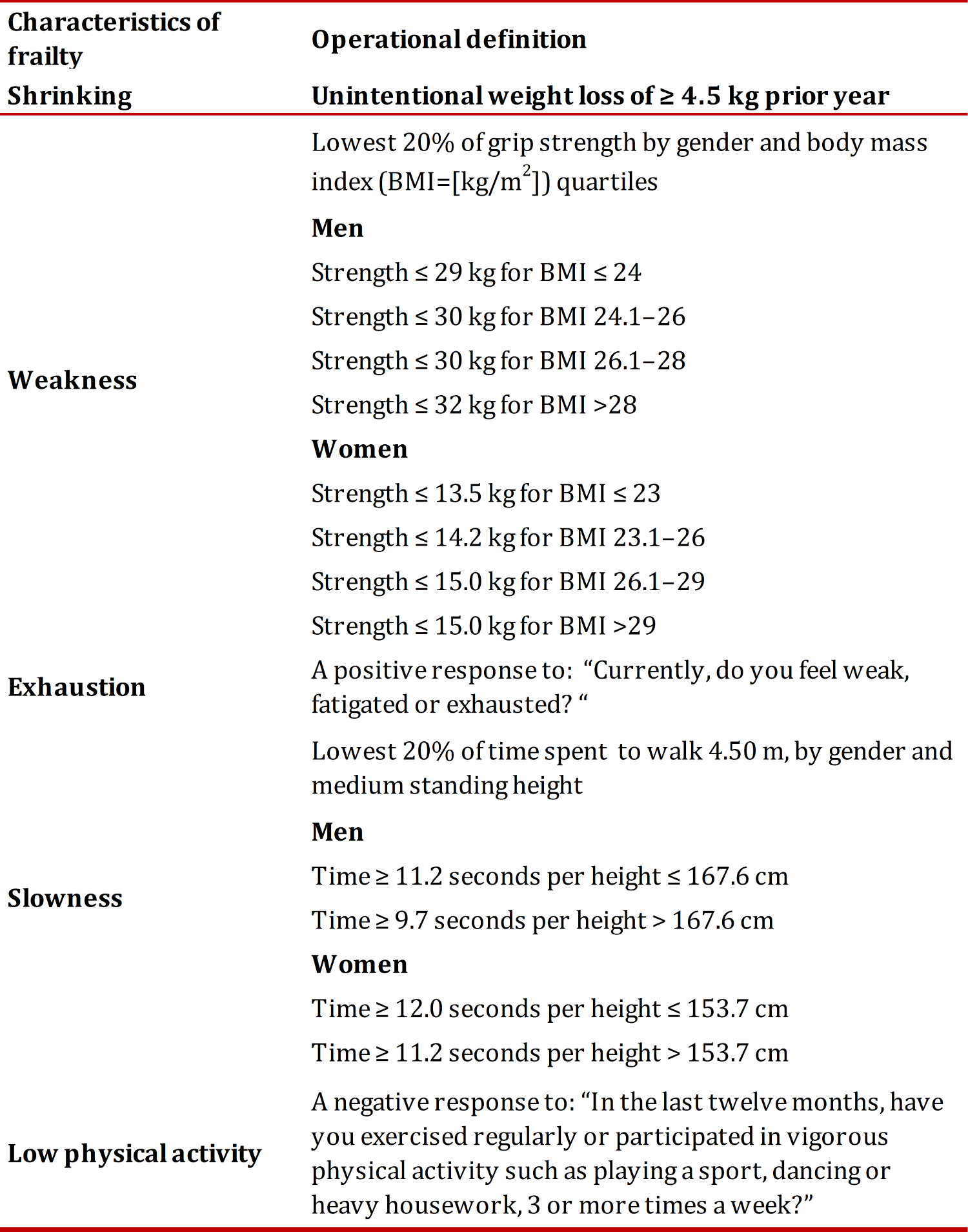 The assessment of frailty syndrome was performed based and adapted from the phenotype described by Fried and colleagues 17 which includes five criteria: shrinking, weakness, exhaustion, slow walking speed and low level of physical activity (Table 1). A person having any of the criteria was assigned a score of 1, with a potential summative score range from 0 to 5. Frail older adults were considered those who met three or more criteria, pre-frail those who met one or two of these criteria and non-frail those who did not have any of them. All five components from the original phenotype were retained fro our study; however, two of the measures were slightly different (exhaustion and low physical activity) and defined as follows: