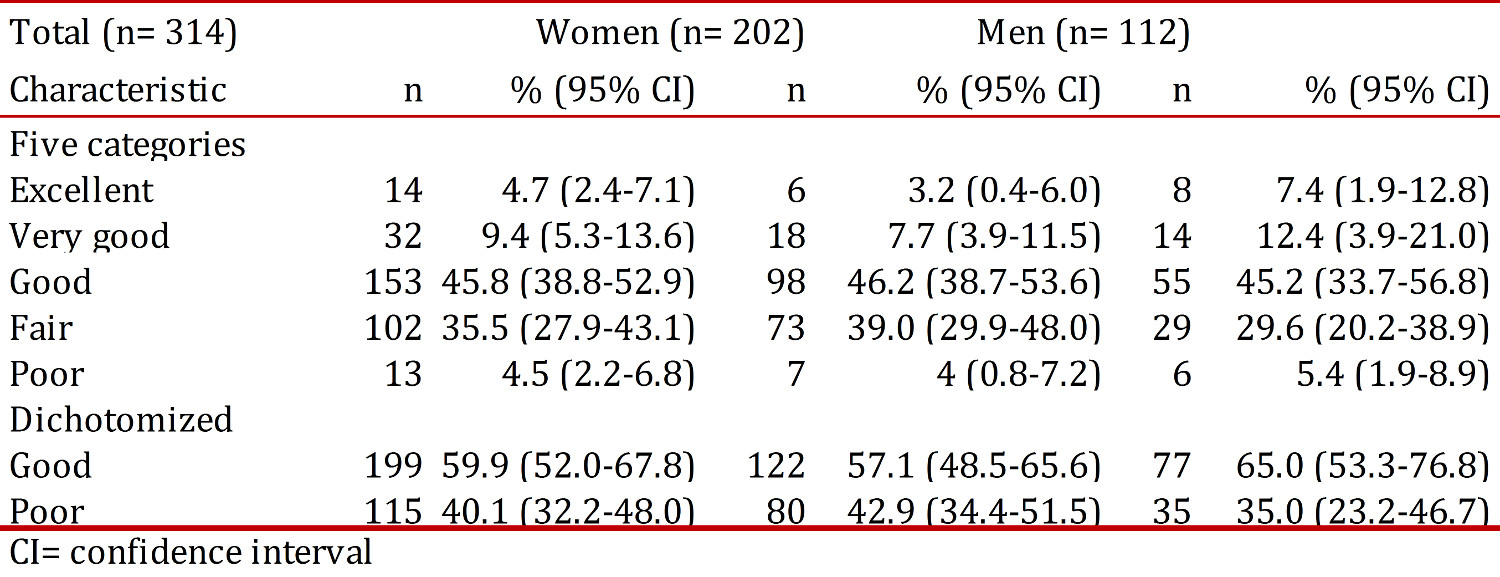 The prevalence of poor self-rated health in the total population was 40.1% (95% CI 32.2-48) and after stratification by gender was 42.9% (95% CI 34.4-51.5) for women and 35.0% (95% CI 23.2-46.7) for men (Table 2). There was no statistical difference between men and women.