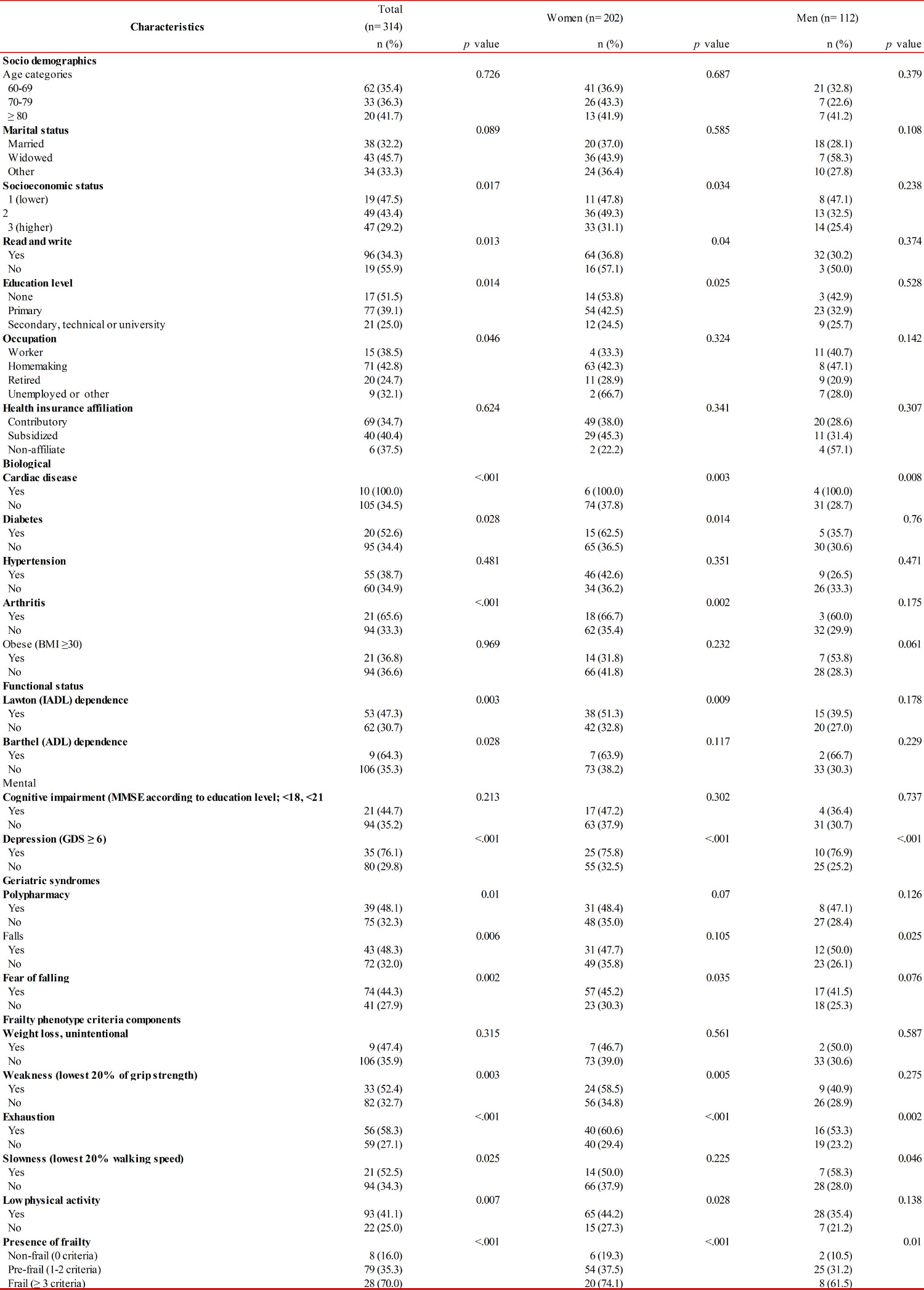 The independent variables were grouped into five subgroups: sociodemographic, biological, mental, functional and geriatric syndromes. Sociodemographic variables were age, marital status, socioeconomic status, literacy, education level, occupation, and health insurance affiliation. Age (years) included these groups: 60-69, 70-79, and 80+. Marital status included married, widowed and other. Socioeconomic status included 1= low-low, 2= low and 3= medium-low; these categories reflect the government area-based socioeconomic stratification based on physical characteristics of the houses, surrounding environment, and urbanistic context. Literacy included being able to read and write (yes/no). Education categories included none, primary, and secondary (high school) or technical/university. Occupation categories included worker, homemaking, retired, and unemployed/other. Health insurance affiliation included these categories: contributory (worker pay to insurer), subsidized (government pay to insurer), and non-affiliate (none).