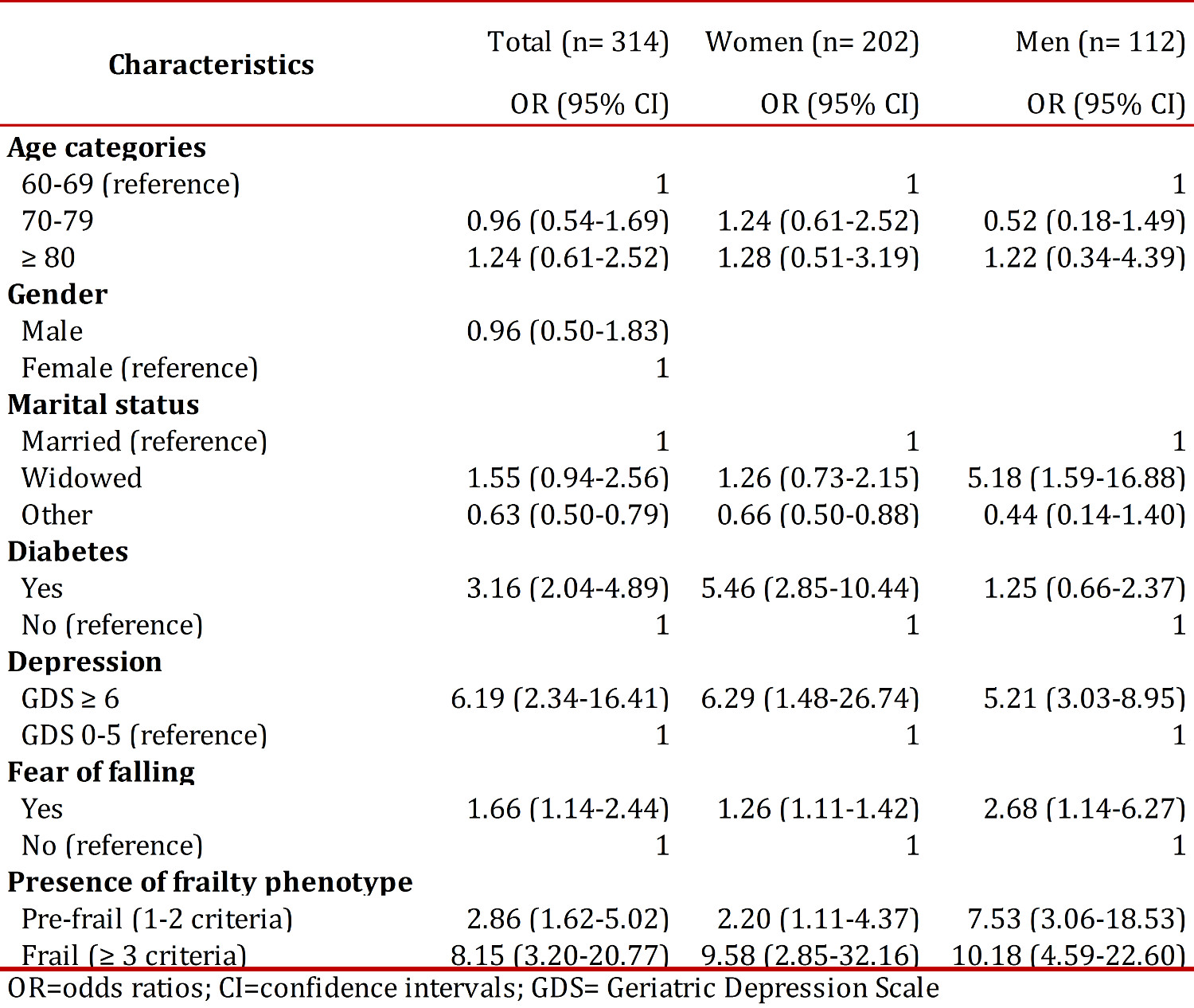 Table 3 shows the distribution of poor self-rated health by socio-demographics, biological, functional, and mental variables, and geriatric syndromes. In the total population, variables significantly associated with poor SRH were lower socioeconomic status, lower education level, cardiac disease, diabetes, arthritis, dependence in IADL (Lawton) and ADL (Barthel), higher depression scores, polypharmacy, falls, fear of falling, weakness, exhaustion, slowness in walking, low physical activity and the frailty syndrome. In women, variables significantly associated with poor SRH were lower socioeconomic status, lower education level, cardiac disease, diabetes, arthritis, dependence in IADL (Lawton), higher depression scores, fear of falling, weakness, exhaustion, low physical activity and the frailty syndrome. In men, variables significantly associated with poor SRH were cardiac disease, higher depression scores, falls, exhaustion, slowness in walking, and the frailty syndrome.
