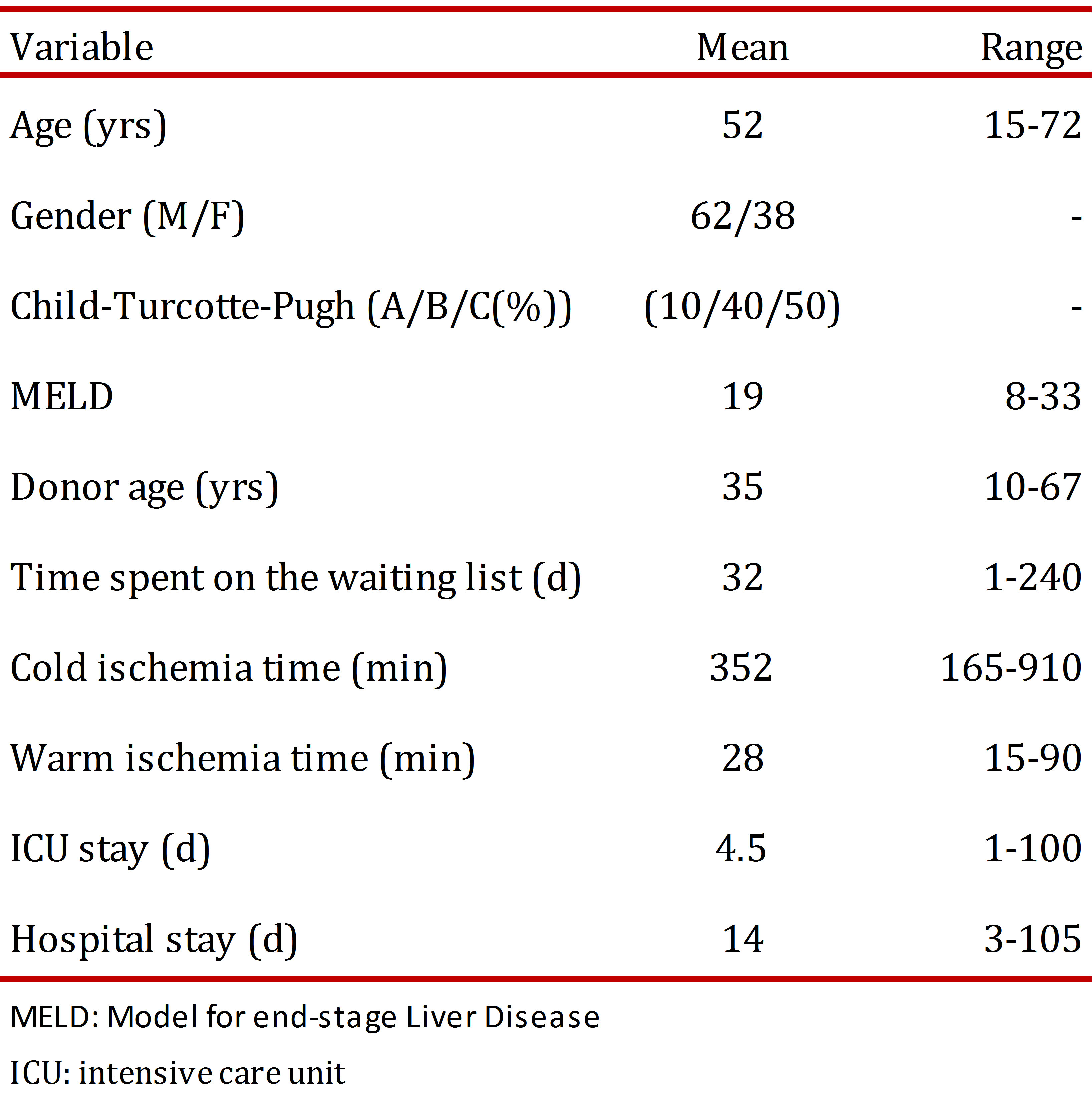 Between February 2004 and December 2010, 305 orthotopic liver transplantations were performed on 272 adults and 33 children at the Pablo Tobon Uribe Hospital in Medellin, Colombia. All donors were deceased. This is a retrospective descriptive study included all patients with liver transplantation adults and were excluded pediatric patients, retransplantation and multivisceral transplants. Of the adult patients, 241 were undergoing their first liver transplantation. Demographic, morbidity, and mortality data were obtained through a retrospective review of medical records and the liver transplantation database. Our multidisciplinary team of adult liver transplant is constituted by 3 transplant surgeons, 4 hepatologists, 4 anesthesiologists, 1 psychologist, 1 social worker and a nurse coordinator. This procedure was authorized by the Hospital's ethical review board. A staging of liver disease severity was carried out for all patients using the Child-Turcotte-Pugh (Child) classification and the MELD score. All patients with hepatocellular carcinoma (HCC) had to comply with the Milan criteria in order to undergo transplantation. Individuals with acute liver failure underwent transplantation when they complied with the King's College criteria for poor prognosis. The conventional immunosuppressive treatment consisted of cyclosporine or tacrolimus, azathioprine or mycophenolate mofetil, and steroids. The latter were suspended 3 to 6 months after the procedure. We aimed to discontinue azathioprine or mycophenolate mofetil after the first year in all cases, except for those patients with autoimmune liver disease. Individuals with immunoglobulin G for cytomegalovirus (CMV) positive donor/negative receptor were treated with ganciclovir/valganciclovir prophylaxis for the first three months. The patients who had two recognized risk factors for invasive fungal infections received Fluconazole for seven days. Additionally, all individuals received Aciclovir for 30 days and Trimethoprim/Sulfamethoxazole for six months. Patients with chronic hepatitis B infection continued to be treated with oral antiviral therapy, and intramuscular immunoglobulin against hepatitis B was added for an indefinite period. In the event of moderate to severe acute rejection confirmed through biopsy, treatment with methylprednisolone bolus was used. Some patients with renal dysfunction who were not candidates for a combined liver and kidney transplantation, fell into the B or C category of the Child classification, and had ascites were administered Basiliximab in order to allow for a later introduction of the calcineurin inhibitor. The surgical technique used in the vena cava was Piggy-back, with no need for a veno-venous bypass in any patient. The conventional biliary anastomosis was choledocho-choledochostomy without the use of a T-tube and with hepaticojejunostomy according to the transplant surgeon's judgment. All patients were transferred to the intensive care unit (ICU) in the postoperative period, and an early extubation protocol was implemented.