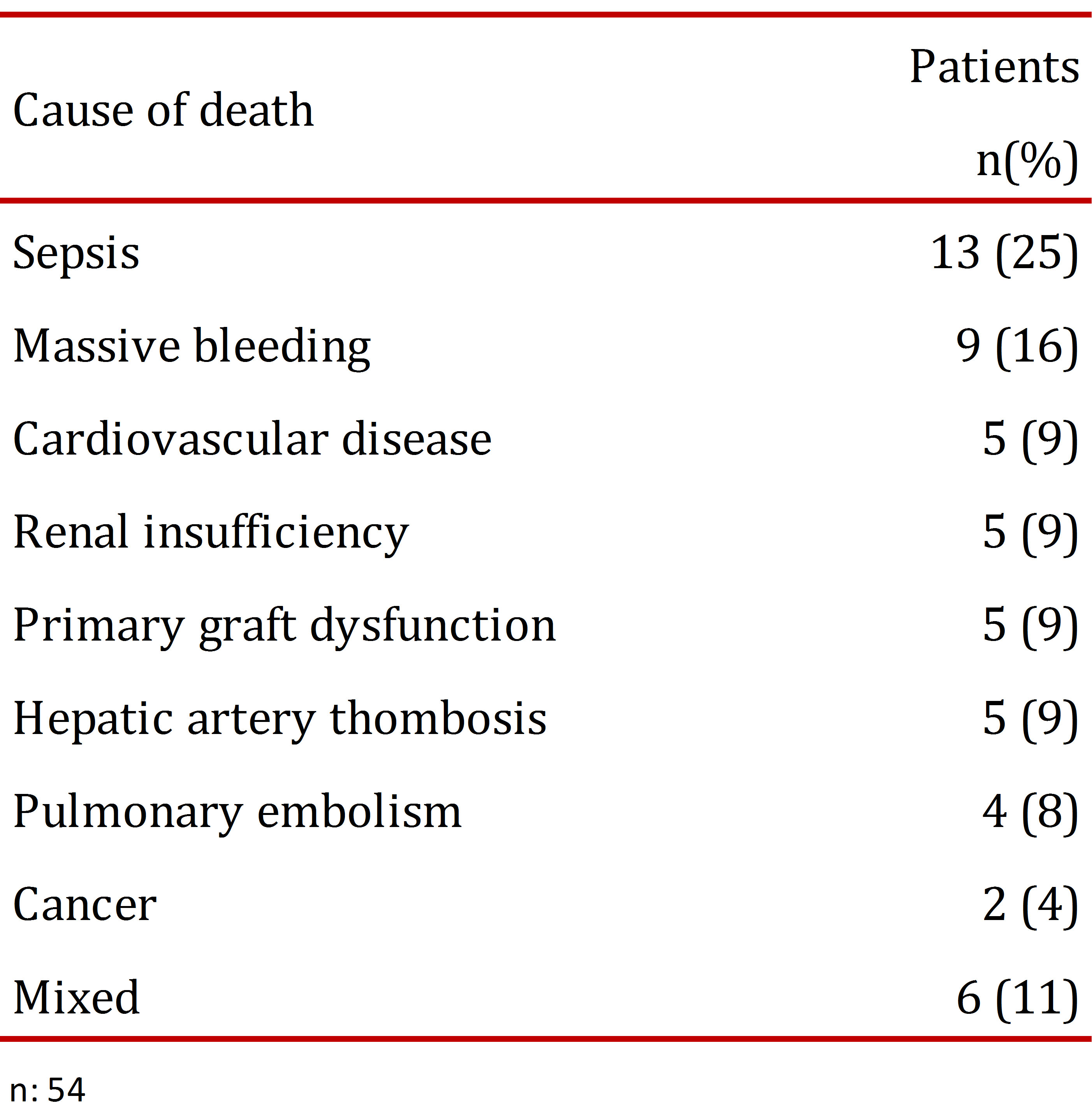 In this study, patient and liver graft survival rates after 5 years were72% and 68% respectively. These rates are comparable to those reported in the U.S. and Europe 3,7. This is relevant, considering that our country has economic limitations and less experience in carrying out this kind of procedure.