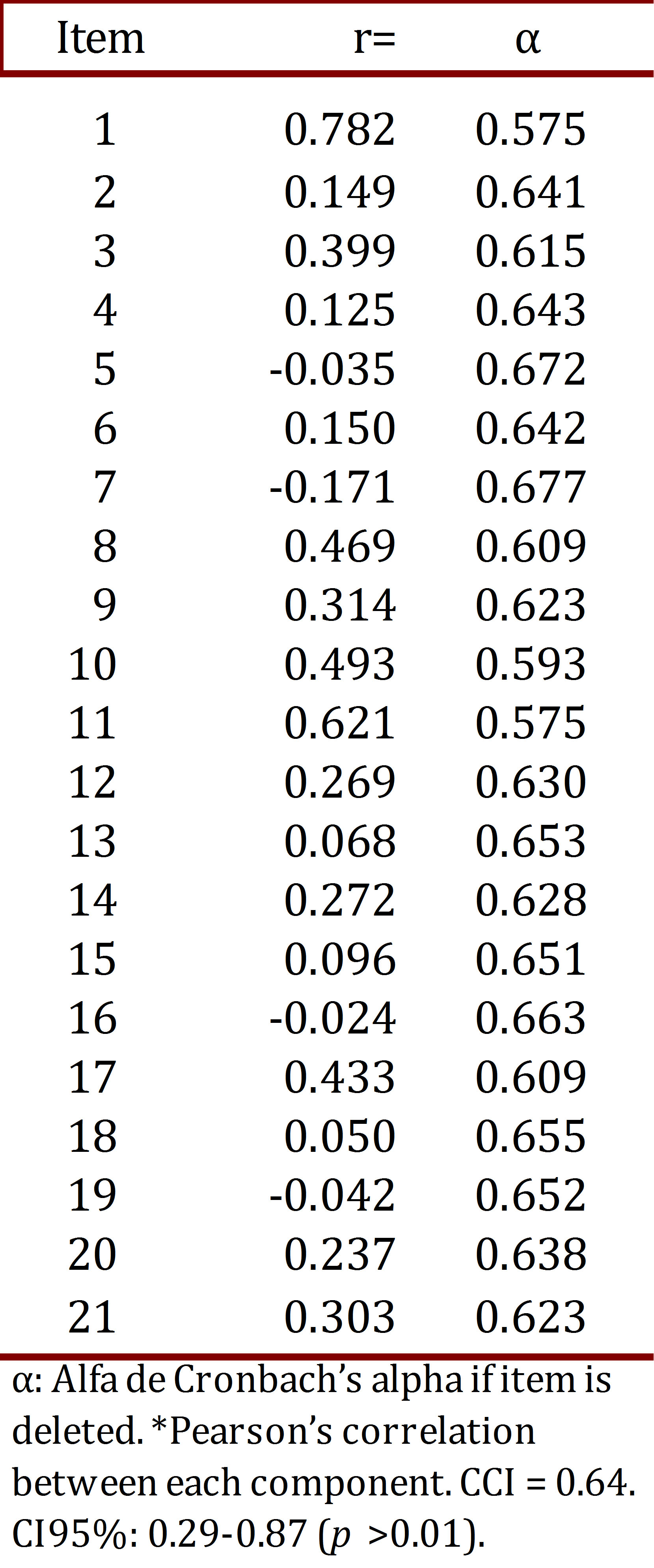 El valor de Alpha de Cronbach para la totalidad del cuestionario es de 0.66. La Tabla 1 muestra el valor obtenido en cada uno de los ítems, y al análisis de la reproducibilidad mediante la prueba test re-test (n= 13), la correlación entre las puntuaciones globales al determinar el coeficiente de correlación intraclase (CCI) fue igual a 0.64 IC95%: 0.29-0.87 (p >0.01).