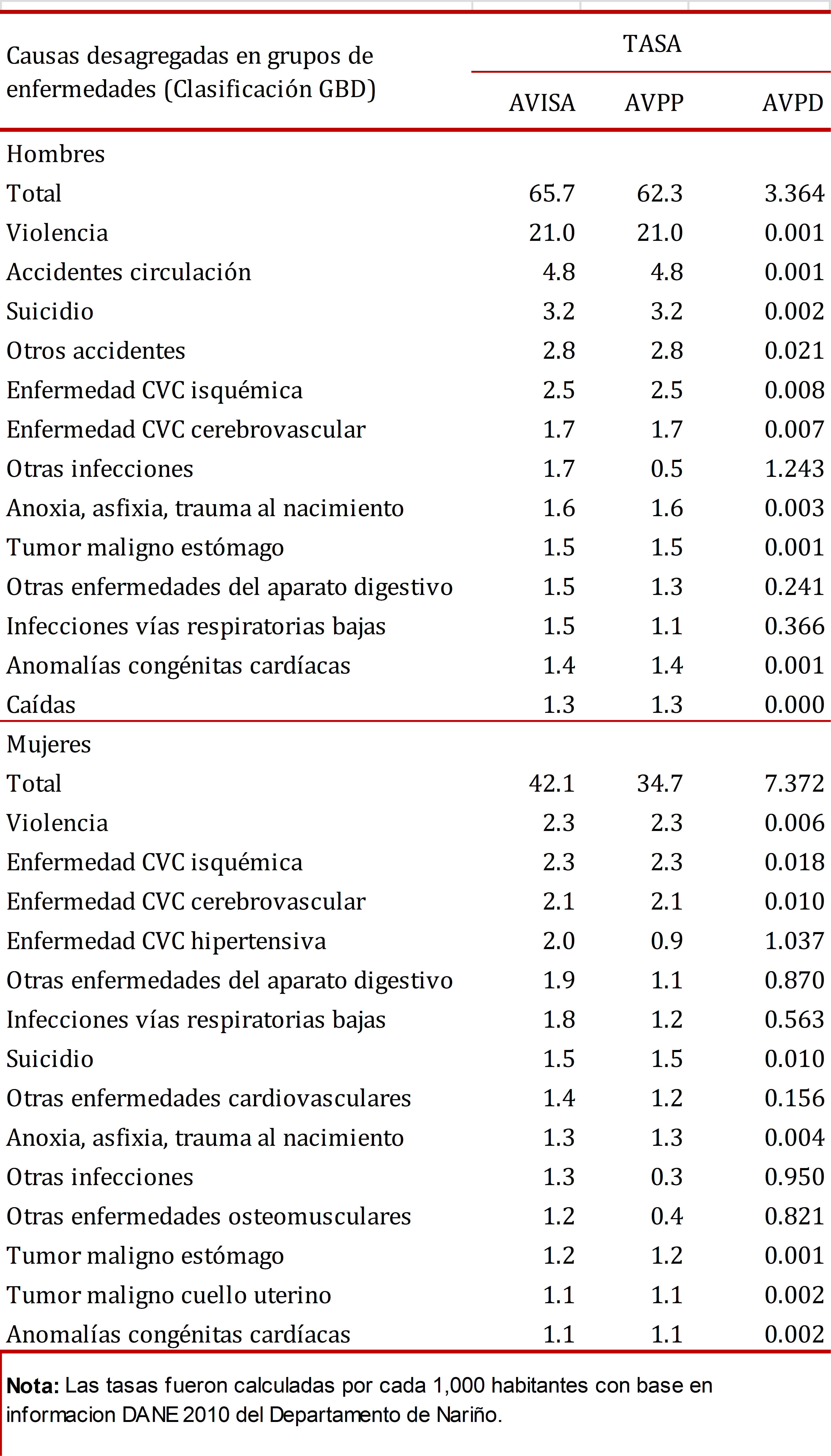 Las primeras cuatro causas de enfermedad en hombres del departamento de Nariño correspondieron a los accidentes y lesiones, específicamente a la violencia con 17,286 AVISA, una tasa de AVISA de 21 por 1,000 habitantes, AVPP de 17,285 y AVPD de 1; accidentes de circulación o de transito con 3,974 AVISA, una tasa de AVISA de 4.8, AVPP de 3,974 y AVPD de 1; suicidio con 2,650 AVISA, una tasa de AVISA de 3.2, AVPP de 2,648 y AVPD de 1; y otros accidentes con 2,338 AVISA, una tasa de AVISA de 3.2, AVPP de 2,321 y AVPD de 17. Las siguientes dos causas correspondieron a enfermedades no transmisibles tales como la enfermedad cardiovascular isquémica con 2,024 AVISA, una tasa de AVISA de 2.5, AVPP de 2,018 y AVPD de 7; y la enfermedad cardiovascular cerebrovascular con 1,398 AVISA y una tasa de AVISA de 1.7, AVPP de 1,392 y AVPD de 6. Las otras ocho causas correspondieron a enfermedades transmisibles, específicamente otras infecciones, que es la causa con más AVPD en hombres con 1,022; anoxia, asfixia, trauma al nacimiento e infecciones de vías respiratorias bajas con 1,199 AVISA, asimismo se destacan el tumor maligno de estómago; las anomalías congénitas cardíacas y otras enfermedades del aparato digestivo; mientras de accidentes y lesiones se destacan las caídas y ahogamientos (Tabla 1 y 2).
