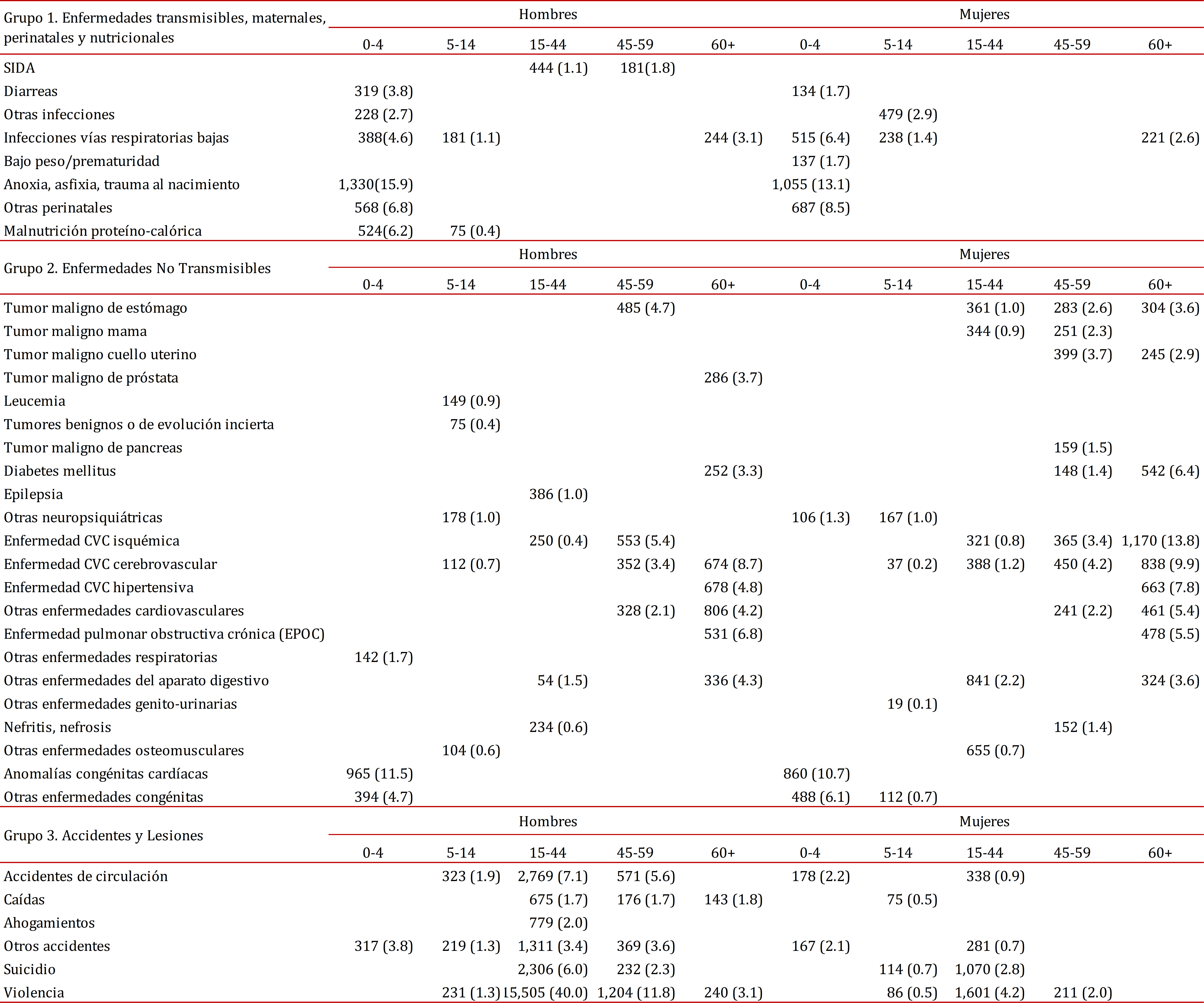 Entre las diez primeras causas en hombres del grupo de edad de 60 años y más se destacaron las enfermedades no transmisibles, tales como: otras enfermedades cardiovasculares, la enfermedad cardiovascular hipertensiva, enfermedad cardiovascular cerebrovascular, la enfermedad pulmonar obstructiva crónica (EPOC), otras enfermedades del aparato digestivo, la diabetes mellitus y el tumor maligno de próstata; entre los accidentes y lesiones se destacaron la violencia y las caídas; y en el grupo de enfermedades transmisibles se destacaron las infecciones de vías respiratorias bajas. Entre las diez primeras causas en mujeres en el grupo de edad de 60 años y más, no hay accidentes y lesiones pero se destacaron la enfermedad cardiovascular isquémica, la enfermedad cardiovascular cerebrovascular, la enfermedad cardiovascular hipertensiva, la enfermedad pulmonar obstructiva crónica, otras enfermedades cardiovasculares, otras enfermedades del aparato digestivo, la diabetes mellitus, el tumor maligno de cuello uterino y el tumor maligno de estómago. En el grupo 1 se destacan las infecciones de vías respiratorias bajas (Tabla 2).