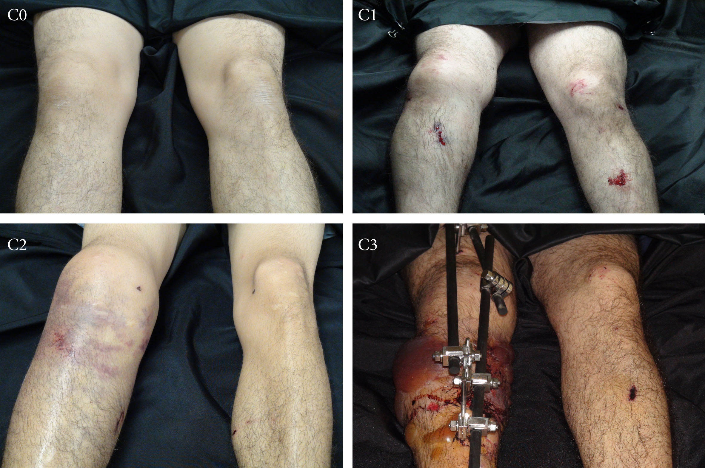 Por lo anterior la determinación de la gravedad de la lesión inicial de los tejidos blandos, es hoy en día uno de los factores más relevantes para definir el manejo inicial y ayudar al cirujano a tomar decisiones sobre que técnicas de fijación ósea debe utilizar 6. Sin embargo, es usual que la evaluación de la gravedad de estas lesiones sea subjetiva y varíe entre cirujanos, por esta razón se han propuesto diversas clasificaciones para tratar de estandarizar la medición de la magnitud de la lesión tegumentaria 7. La clasificación más utilizada en la literatura para describir la lesión de los tejidos blandos en trauma cerrado es la clasificación de Oestern y Tscherne 8-10, publicada a comienzos de la década de los ochenta, esta clasificación determina la gravedad del trauma cerrado de tejidos blandos desde 0 hasta 3, siendo cero una lesión mínima o inexistente y tres la lesión más grave que incluye el síndrome compartimental y las lesiones vasculares (Fig. 1).