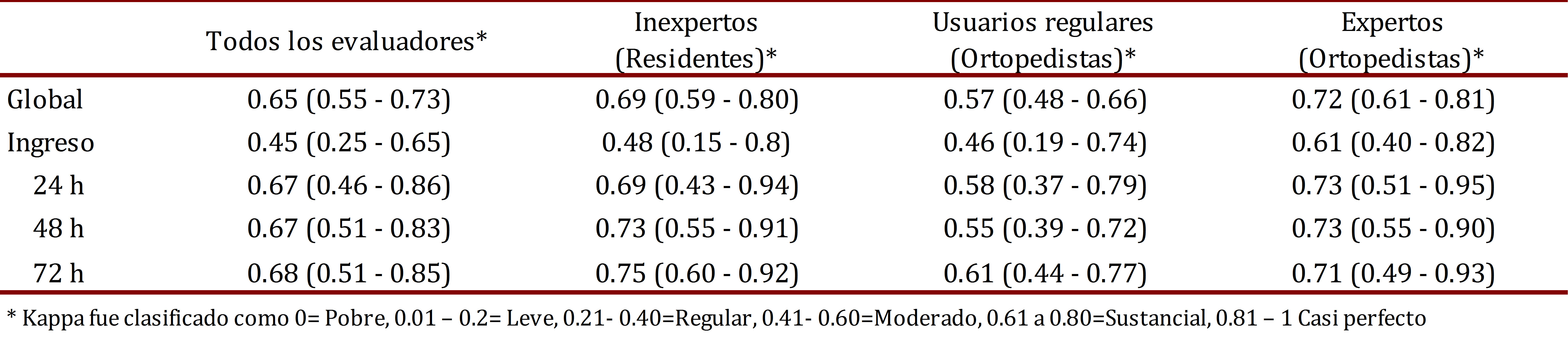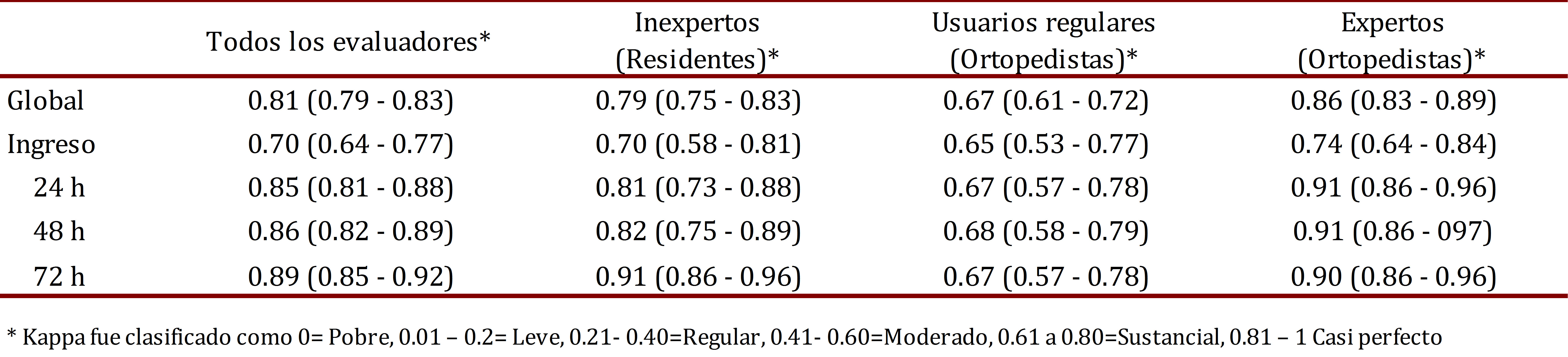 En cada sesión de evaluación se registraron los resultados en un documento diseñado para tal fin. El análisis de las variables cuantitativas se hizo con los estadísticos descriptivos, medias y medianas con desviaciones estándar y rangos intercuartílicos, respectivamente, y proporciones para las variables cualitativas. En el análisis de concordancia intraobservador se utilizó el estadístico Kappa ponderado por pesos cuadráticos y para el interobservador se utilizó el estadístico Kappa ponderado por pesos cuadráticos con más de 2 evaluadores y más de 2 categorías siguiendo el método propuesto por Fleiss 14. Los resultados se presentan con Kappa por categoría de la clasificación, por momento en la evolución (Ingreso, 24, 48 y 72 horas) y por nivel de entrenamiento, cada uno con sus respectivos intervalos de confianza. Se clasificó el índice de Kappa encontrado utilizando el sistema propuesto por Landis y Koch 15: 0= Pobre, 0.01-0.2= Leve, 0.21-0.40=Regular, 0.41-0.60=Moderado, 0.61-0.80= Sustancial, 0.81-1= Casi perfecto.