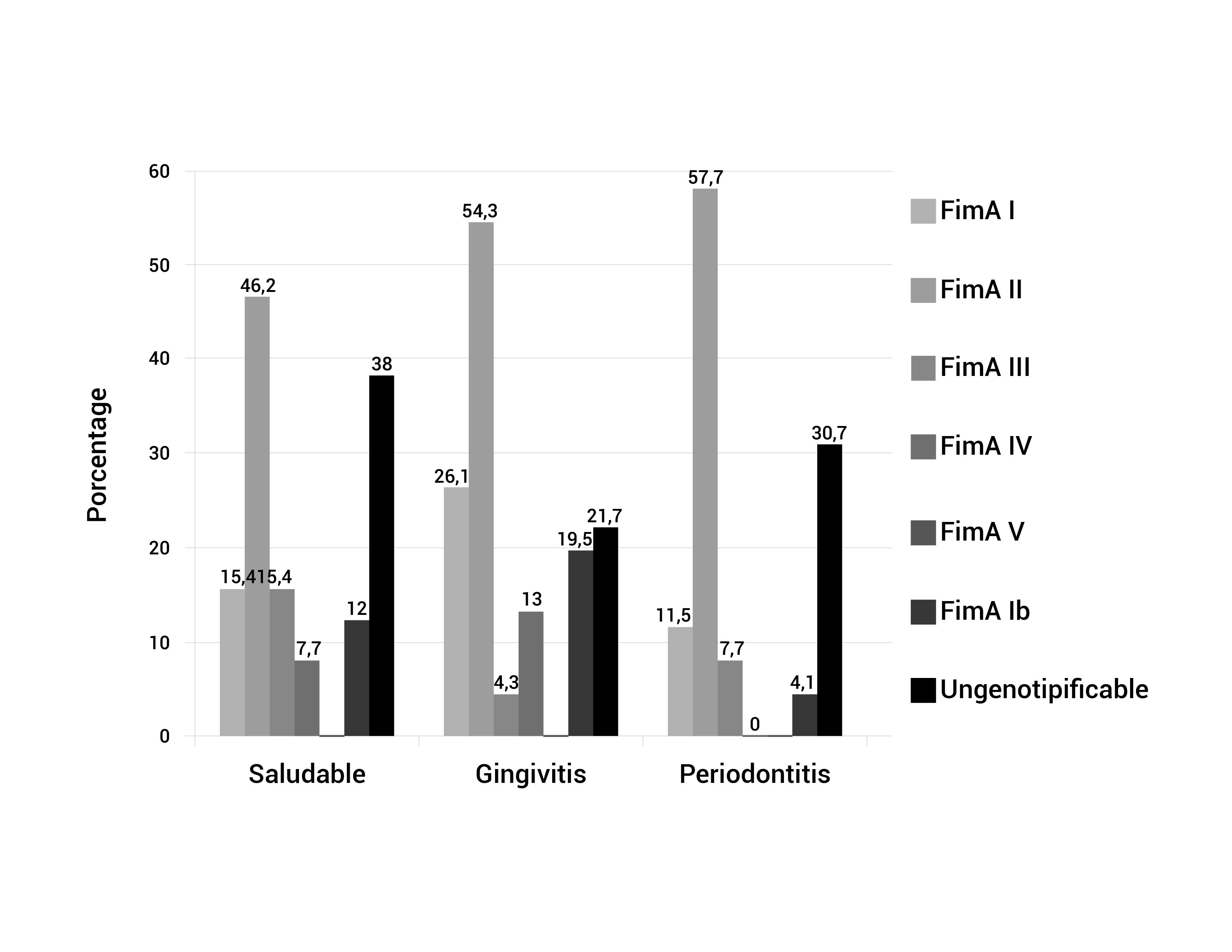En sujetos con periodontitis los genotipos FimA II y FimA IV han sido identificados con mayor frecuencia en contraste con los sujetos sanos en los que el genotipo FimA I es el más frecuente 11-14.
