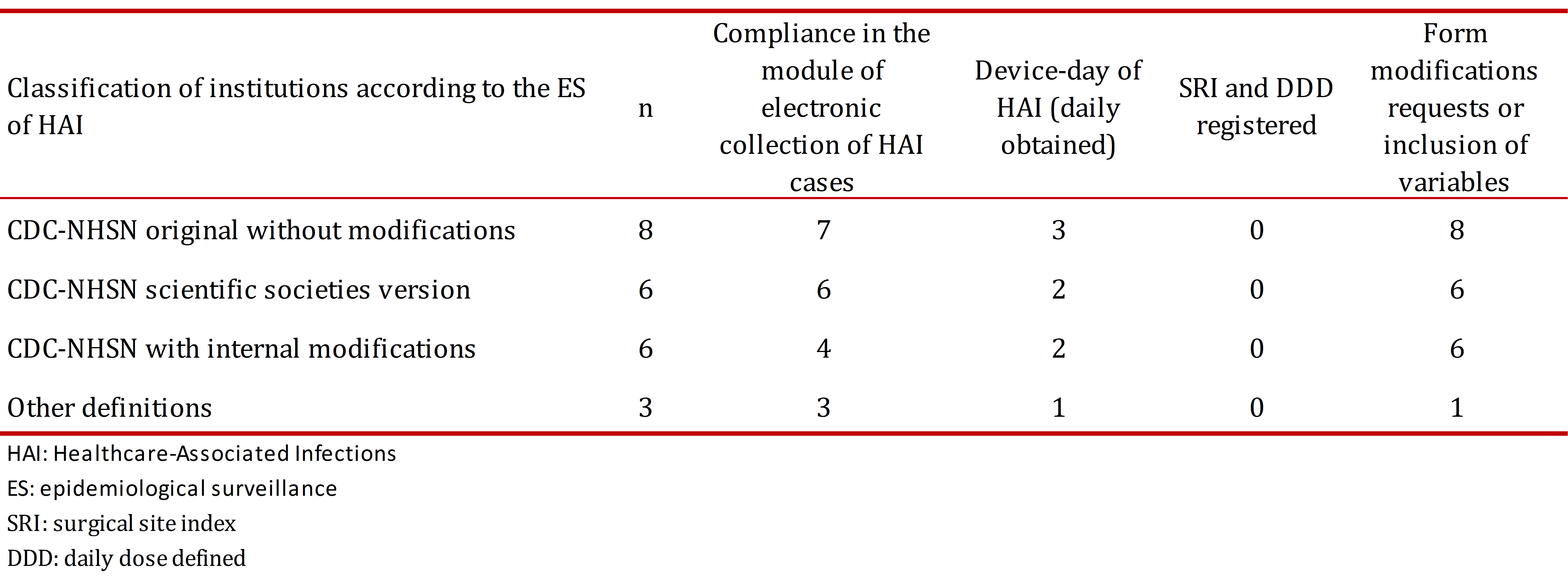 Eighty-seven percent (20/23) of institutions reported conducting the ES of the HAI using the criteria of NHSN-CDC, 14% had HAI definitions published in 2011, 71% in 2010 and the remaining 15% continued with 2009 or earlier definitions. Of the 20 institutions that performed the ES with NHSN-CDC criteria, 30% presented definitions of medical associations or research groups that included changes in the criteria of device-associated HAI. Simultaneously, during the verification visit, 57% of institutions that adopted the NHSN-CDC criteria from the original source included institutional changes for the interpretation of those criteria.