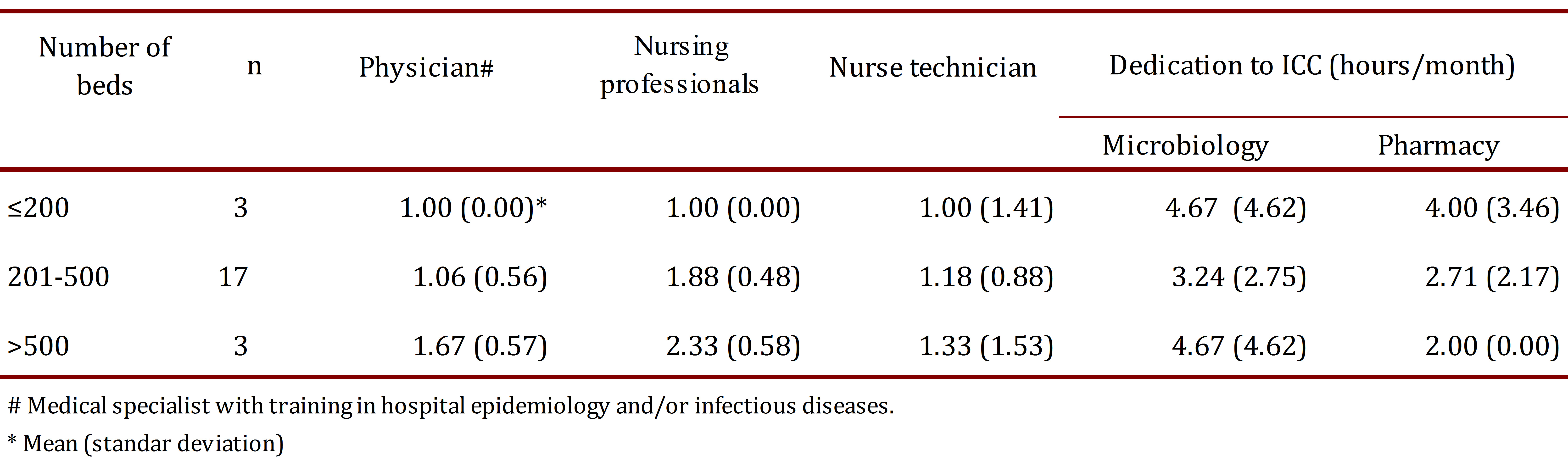 Therefore, it is necessary to strengthen ES programs before introducing computer tools for ES in the IC; it is required to have a larger number of professionals trained or specialized in infectious diseases and infection as part of the ICC 8. According to the SENIC project (in 1976), it is necessary to have at least one nurse for every 250 beds, a microbiologist and a referent in infectious diseases; with this proportion was demonstrated that HAI could be reduced as low as 32% 22. The ICC evaluated on our network preserved this relation, having up 2.3 professionals in institutions with more than 500 beds; however with changes in the health care system currently involving complex care of patients in acute care institutions, the functions and obligations has increased; and therefore, the responsibilities of nurses in ICC need to be closely considered. For all of these reasons, it should be required to increase the ratio of professionals by number of beds in institutions with high rates of HAI, in order to be at least 1 person per 100 beds 23.
