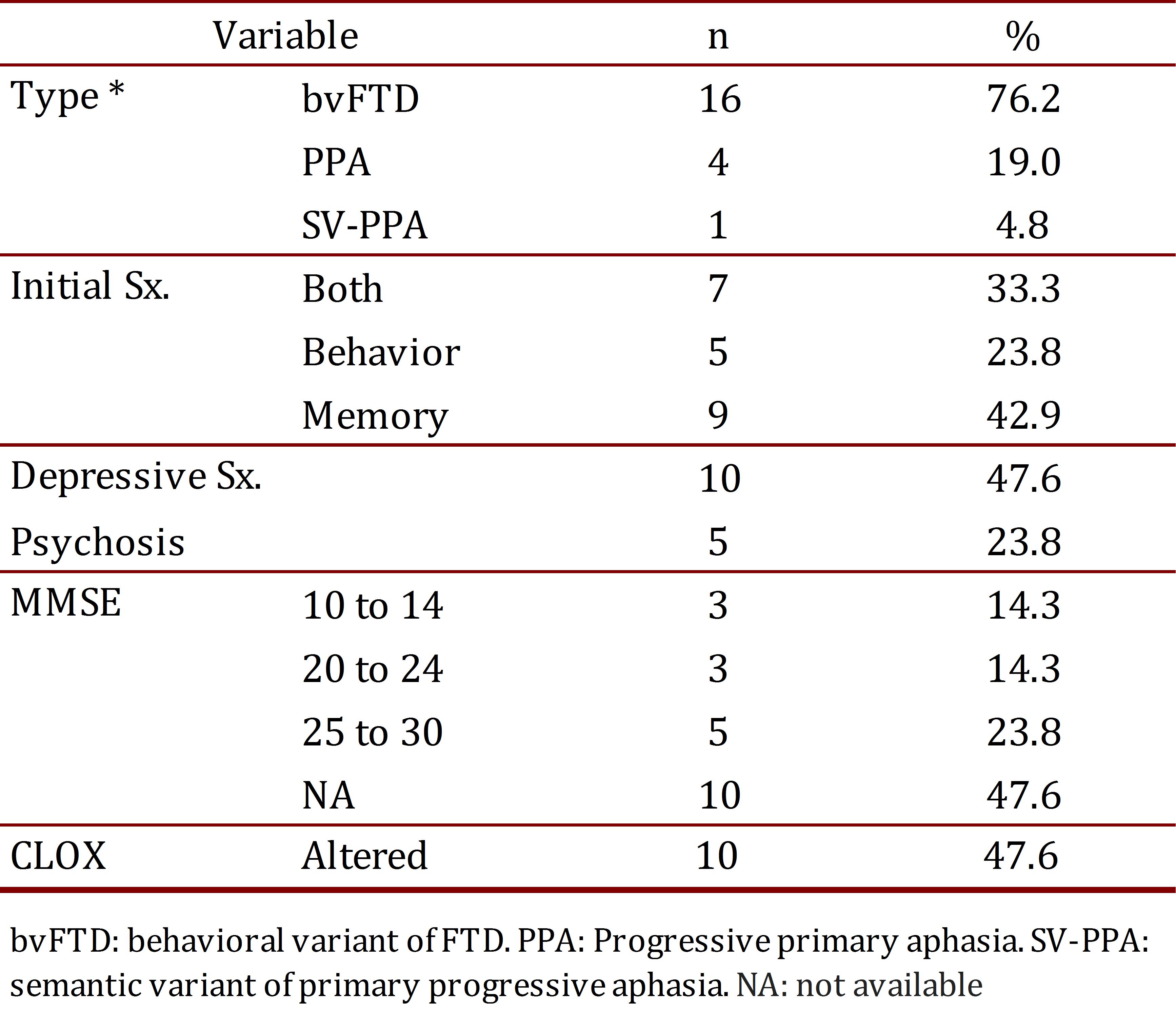 The most frequent variant of dementia found was the behavioral variant (16 patients), followed by primary progressive aphasia (4 patients) and semantic dementia (1 patient). The most prevalent initial symptom was changes in memory (42.9%). A total of 47.6% of the patients suffered from depressive symptoms (sadness, frequent crying, feelings of hopelessness, futility, and/or guilt, changes in sleep patterns, changes in appetite). There was evidence of psychotic symptoms (behavioral changes, delirium, or hallucinations) in 23.8% of the patients. MMSE data was obtained from 52.4% of the sample, with results within normal limits (a score between 25 and 30). Ten patients (47.6%) showed alterations via the CLOX (Table 1).