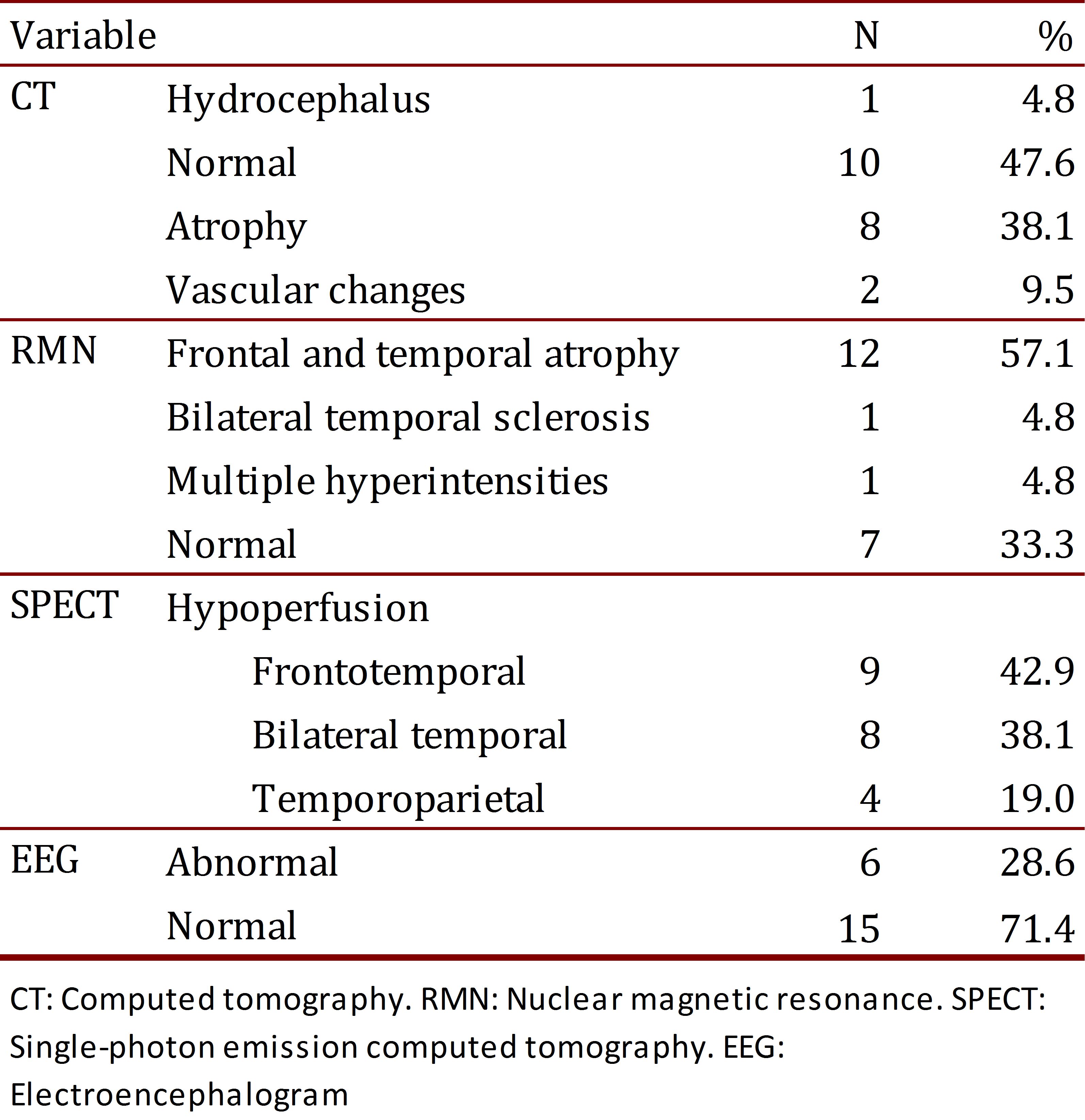 The CT was abnormal in 52.4% of the patients; the most frequent abnormality was cortical atrophy (38.1%). The NMR showed frontal and temporal atrophy in 57.1% of the patients (n= 12), followed in frequency by bilateral temporal sclerosis and multiple hyperintensities. The NMR was normal in 33.3% of the patients (n= 7). Using SPECT, we observed that the majority of patients presented with frontotemporal hypoperfusion (42.9%). A total of 71.4% of the evaluated patients presented with a normal EEG (Table 2).