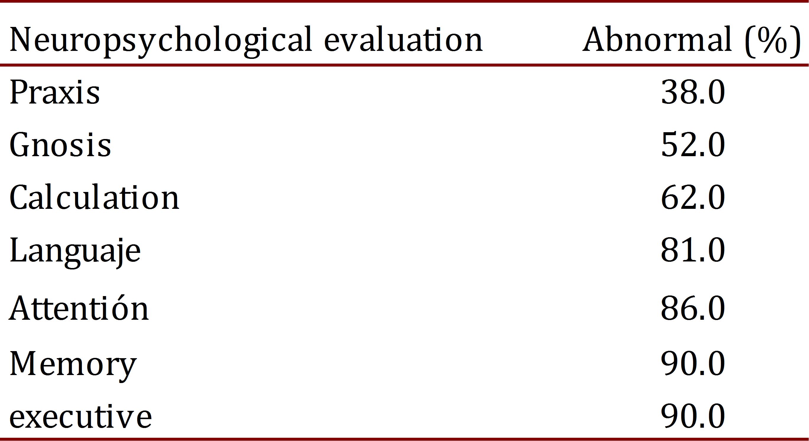A 61.9% prevalence of normal results was found in the neuropsychological tests, with alterations of abnormality found in all elements except for the praxis.