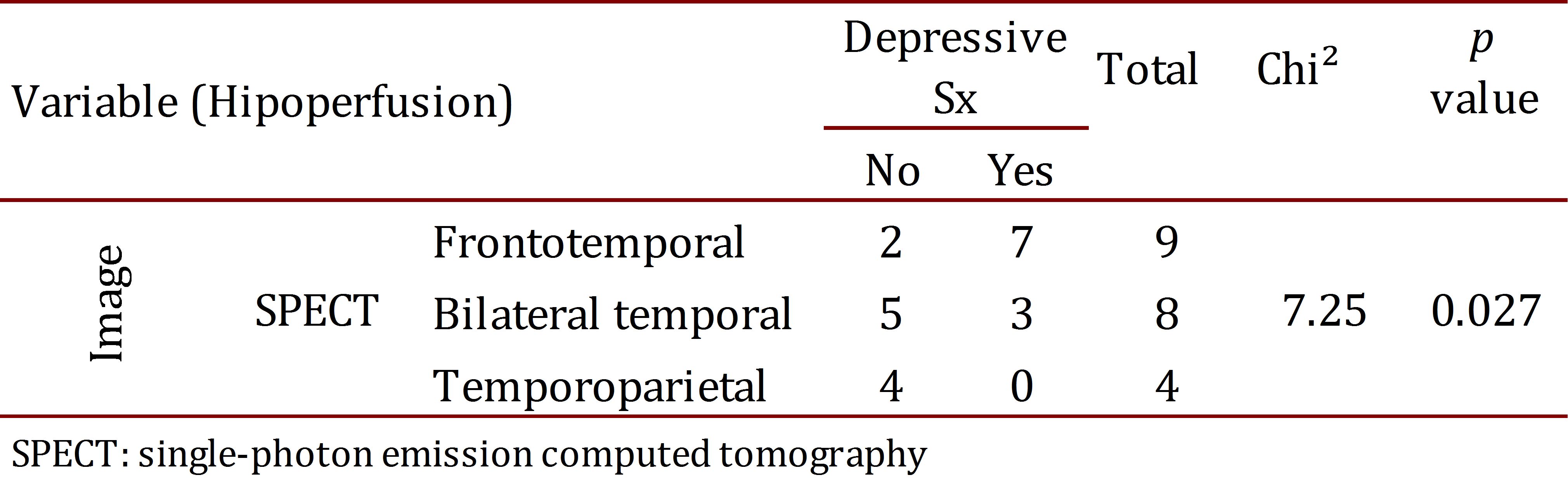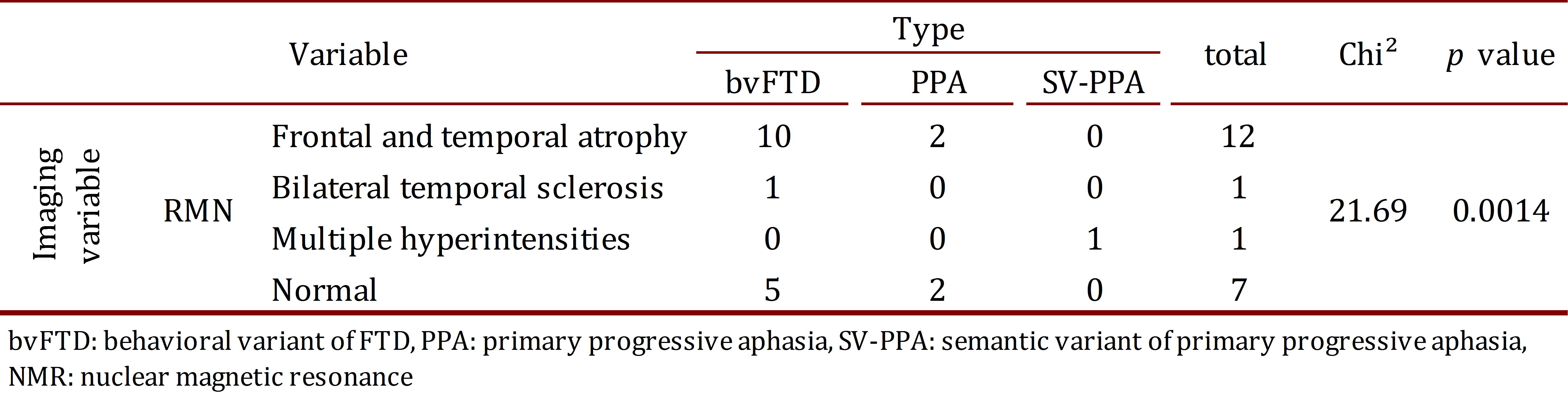 The findings from the SPECT images were related to depressive symptoms (Chi2= 7.25, p= 0.027). Atrophies in the NMR were related to the type of FTD (Chi2= 21.69, p= 0.0014). No other association was found among the imaging findings, the clinical results, and the neuropsychological tests (Tables 4 and 5 ).