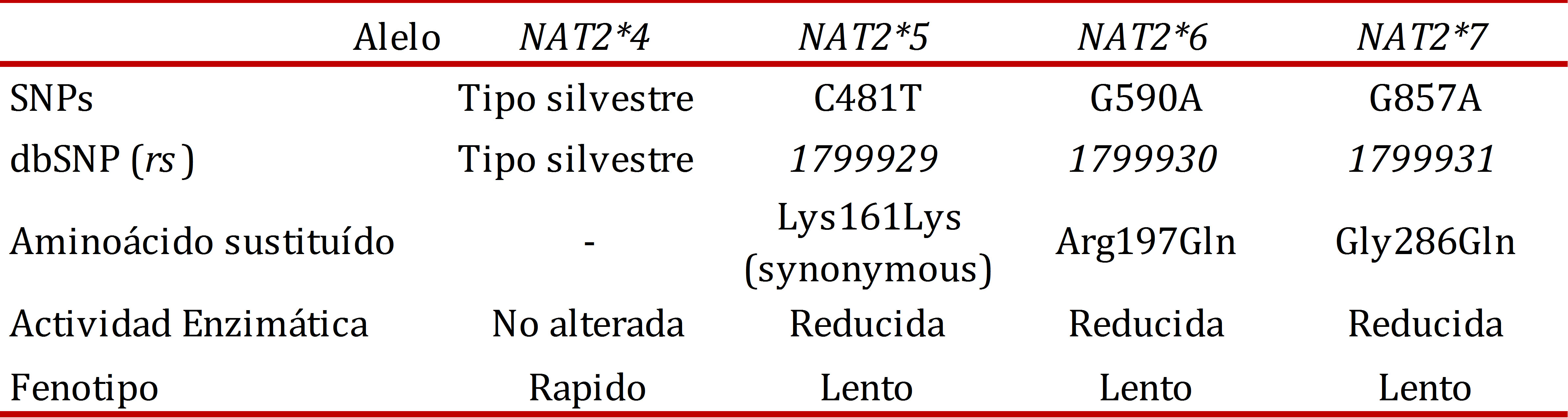 El gen NAT2, tiene cuatro alelos principales: NAT2*4, es el alelo normal o wild-type mientras que NAT2*5, NAT2*6 y NAT2*7 son los alelos mutados determinados por la presencia de los polimorfismos tipo SNP en las posiciones 481C>T, 590G>A y 857G>A respectivamente. El cambio nucleotídico en la posición 481 no origina cambio en el aminoácido codificado, en la posición 590 se origina un cambio del aminoácido Arginina (Arg) por Glutamina (Gln) y en la posición 857 un cambio del aminoácido Glicina (Gly) por Acido glutámico (Glu) 8.