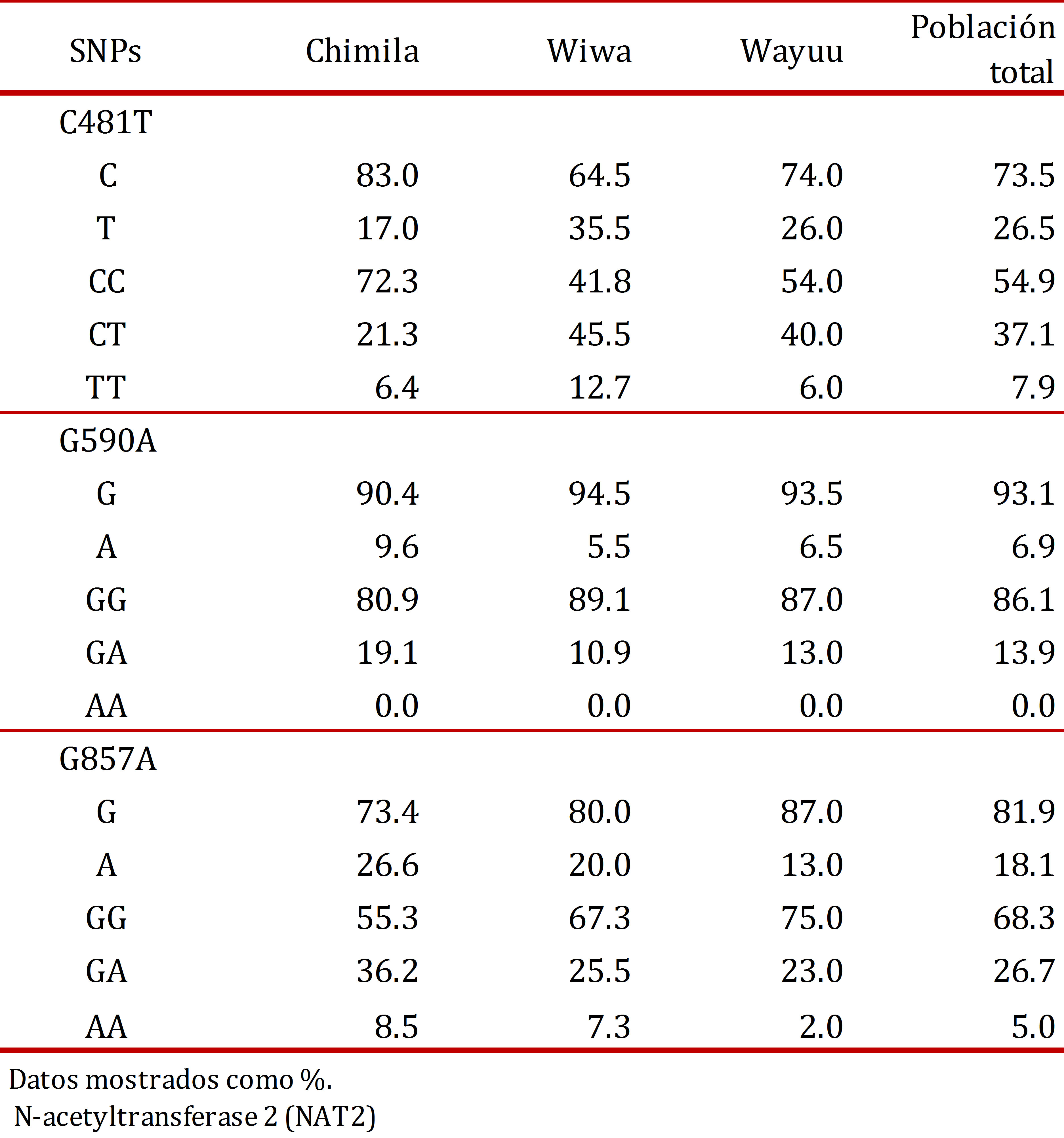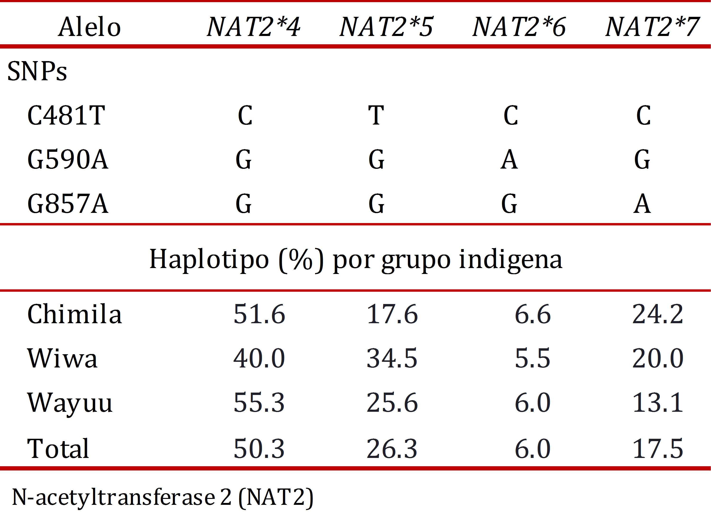 El alelo NAT2*4 (wild type) estuvo presente en el 50.3% de la población total, y más frecuente en el grupo Wayúu (55.3%). Entre los alelos mutados el NAT2*5 fue el más frecuente con 26.3% y el alelo NAT2*6 fue el menos frecuente con 6.0% en la población.