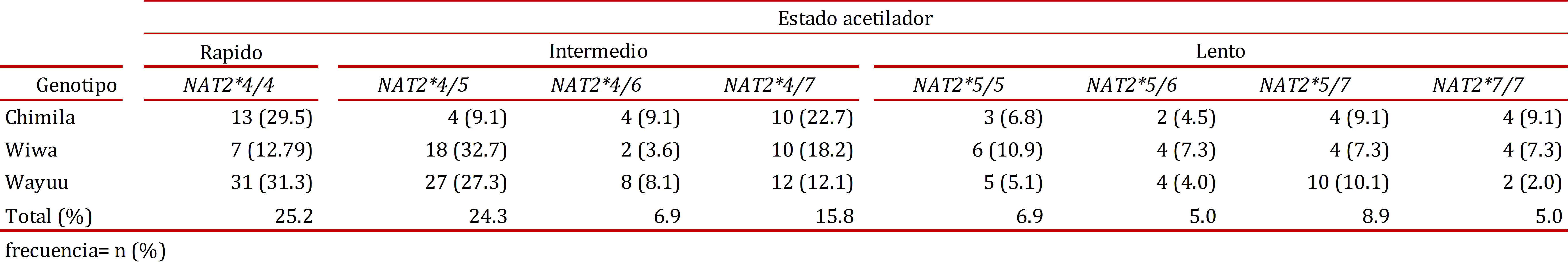 La frecuencia del estado acetilador rápido estuvo más alta en el grupo Wayúu (31.3%) y en el grupo Chimila (29.5%) cuando comparamos con el grupo Wiwa (12.7%). La distribución del estado acetilador intermedio es muy similar entre los tres grupos; para el estado acetilador lento observamos que en el grupo Wiwa la frecuencia es mayor (32.7%) con respecto a Chimila y Wayúu con 20.5% y 21.2% respectivamente (Tabla 4).