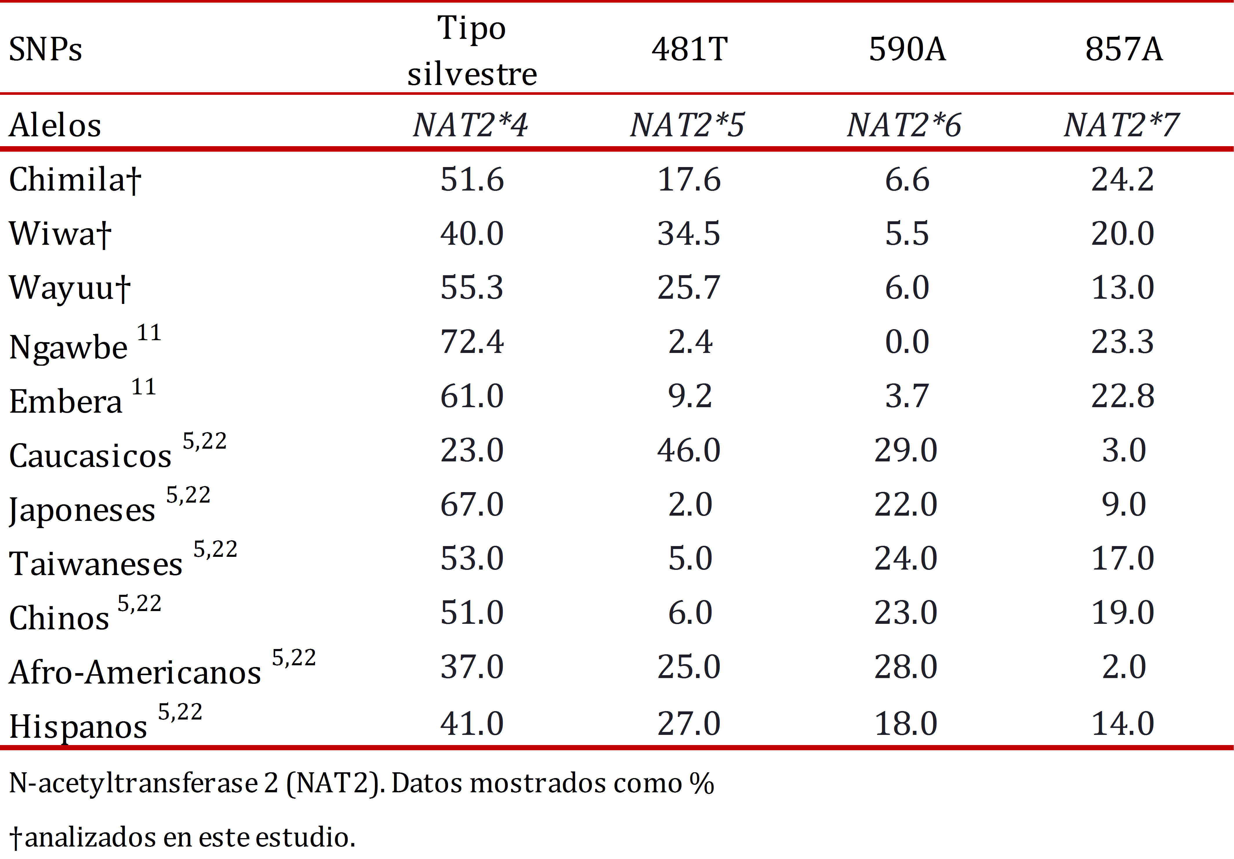 Estudios realizados en poblaciones amerindias de Argentina y Paraguay, han reportado una frecuencia de más del 40% para el alelo NAT2*4 (42.9-80.0%); así mismo, el alelo NAT2*5 se encontró con frecuencias elevadas entre 31.2% y 50.0% en los grupos Mapuche y Tehuelche (Patagonia Argentina) y los grupos Lengua y Ayoreo (Paraguay). El alelo NAT2*6 estuvo presente en un 3% en Wichi y en más del 12% en las poblaciones Jujuy, Mapuche y Tehuelche mientras que el alelo NAT2*7 mostró una alta variabilidad del 4.5% al 42.9% en las diferentes poblaciones 10. Por su parte, Jorge-Nebert et al., reportaron en las poblaciones de Ngawbe y Embera, una frecuencia de 2.4% y 9.9% para el alelo NAT2*5, de 0% y 3.7% para el alelo NAT2*6 y de 23.3% y 22.8% para el alelo NAT2*7, respectivamente 11. En un estudio reciente en las poblaciones nativas de Brasil, encontraron en el grupo amerindio Tupinamba, una frecuencia de 43.3% para el alelo NAT2*5 y NAT2*6 y una frecuencia del 10% para el alelo NAT2*7 12.