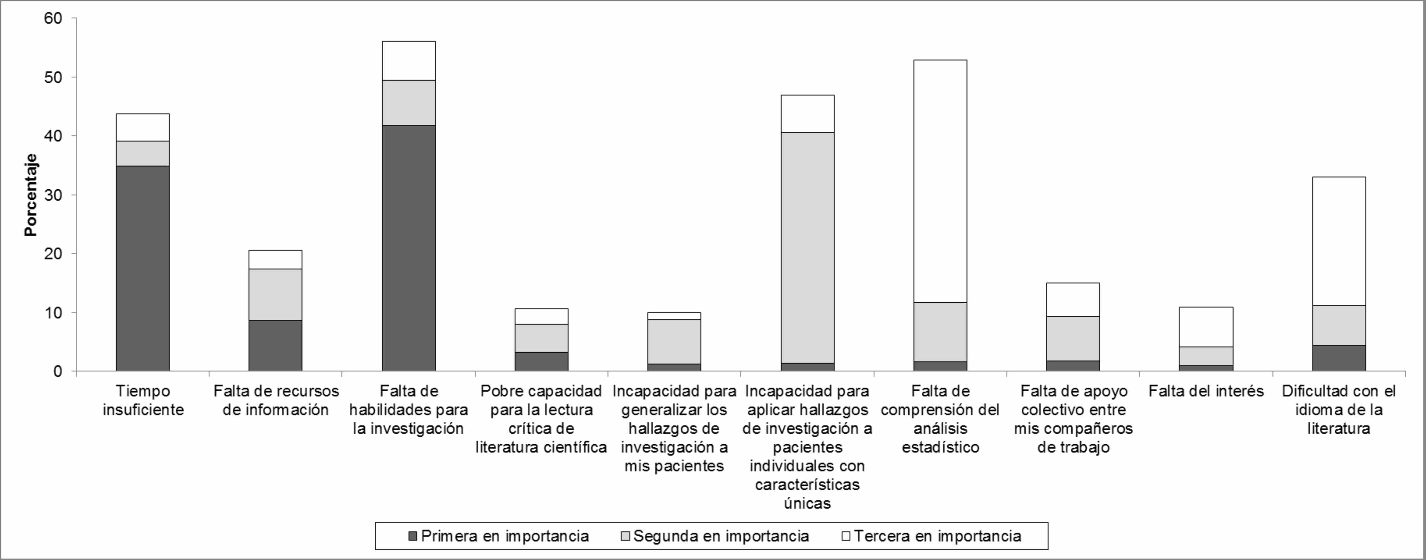 Cuarenta y uno por ciento de los encuestados indicaron que la barrera más importante para la aplicación de la PBE era la falta de habilidades en investigación. El 39.1% y 41.1% de los encuestados calificó la falta de comprensión del análisis estadístico e incapacidad para aplicar hallazgos de investigación a pacientes individuales con características únicas, como la segunda y tercera barrera, respectivamente. La dificultad con el idioma, fue informada como una barrera importante para el 21.9% de los encuestados (Fig. 2).