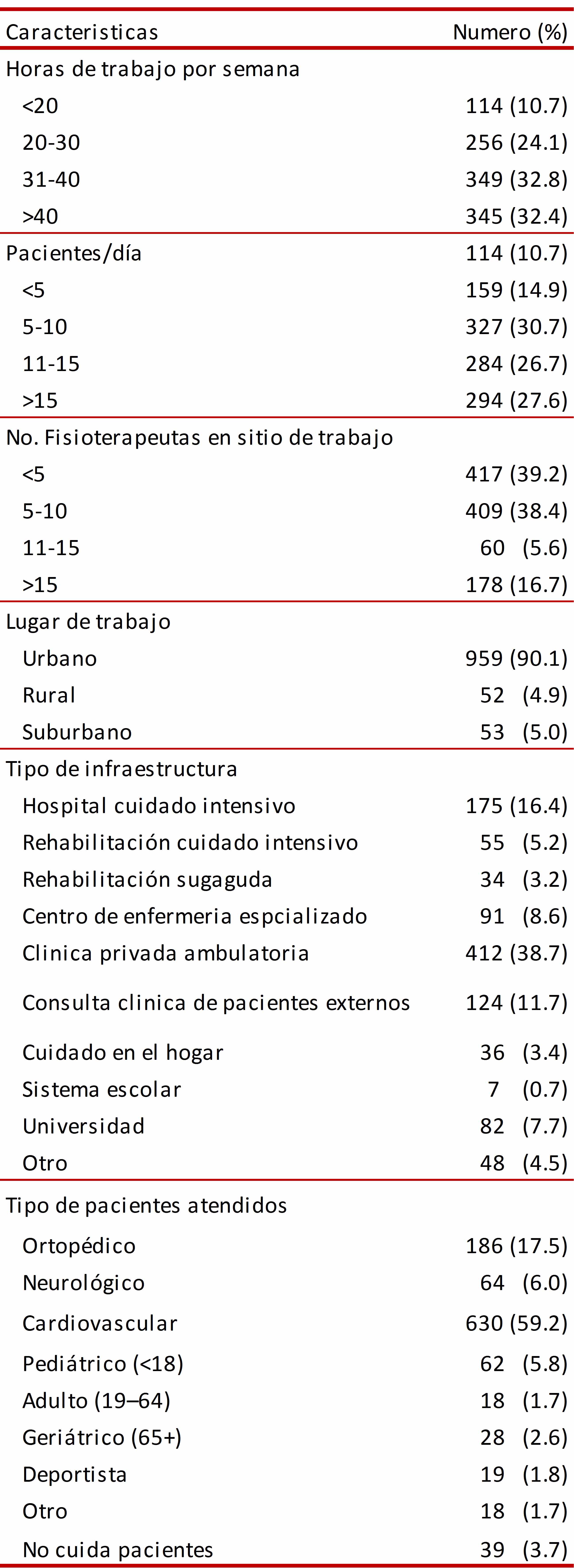 Con relación a las características de la ejecución de la práctica clínica se pudo establecer que la mayoría trabajaba entre 31-40 hs semanales. La mayor proporción de pacientes atendidos por día fue entre 5-10 pacientes (30.7%) y la mayoría de encuestados manifestó realizar su actividad clínica acompañado de, al menos, 5 profesionales (39.2%). Las alteraciones de tipo cardiovascular y respiratorio fue el mayor motivo de consulta por parte de los pacientes que recibían atención. Las demás características de la práctica asistencial se presentan en la Tabla 2.