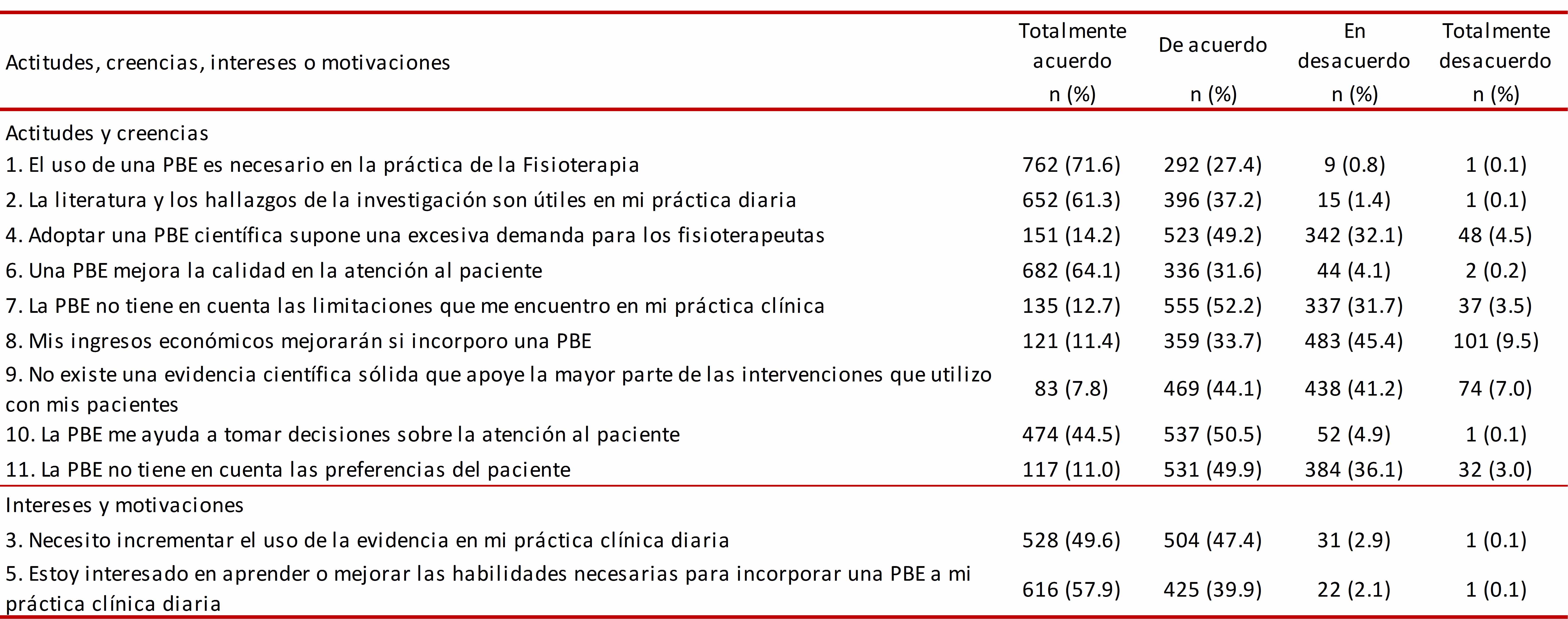 Los autores del estudio aplicaron el cuestionario desarrollado en EEUU por Jette et al. 8, y validado en lengua española por Guerra et al.7, con el objetivo de determinar las actitudes, creencias, habilidades, conocimientos, comportamientos y barreras entre los Fisioterapeutas hacia la PBE. Este cuestionario se estructura en diferentes sub-dimensiones a través de una serie de ítems que se agrupan y recogen información correspondiente a cada una de estas categorías. Los ítems 1, 2, 4, 6-11 recogen datos sobre las actitudes y creencias hacia una PBE; el interés y motivación para efectuar una PBE es medido por los ítems 3 y 5; los antecedentes académicos, conocimientos y habilidades relacionadas con el acceso e interpretación a información científica son recogidos por los ítems 18, 19, 21-23. Las barreras percibidas para el uso de una PBE se recogen en el ítem 32. Los ítems 15-20 informan sobre el uso y acceso a guías de práctica clínica entre los profesionales. También en los ítems 33-50 se recogen datos demográficos y profesionales de los que responden. La estructura de los ítems que recogen datos sobre actitudes, creencias, educación, conocimientos, habilidades relacionados con la PBE son formulados usando una escala ordinal de 0 a 4, siguiendo la adaptación realizada para la versión española, con "Totalmente de acuerdo" y "Totalmente en desacuerdo" como valores máximos y mínimos respectivamente. Otros ítems que recogen datos sobre el acceso a información utilizan respuesta dicotómica "Sí" o "No". Las cuestiones relacionadas con el entendimiento de conceptos científicos relacionados con la PBE requieren respuestas de opción múltiple con tres posibles: "Lo comprendo totalmente", "Lo comprendo parcialmente" o "No lo comprendo".