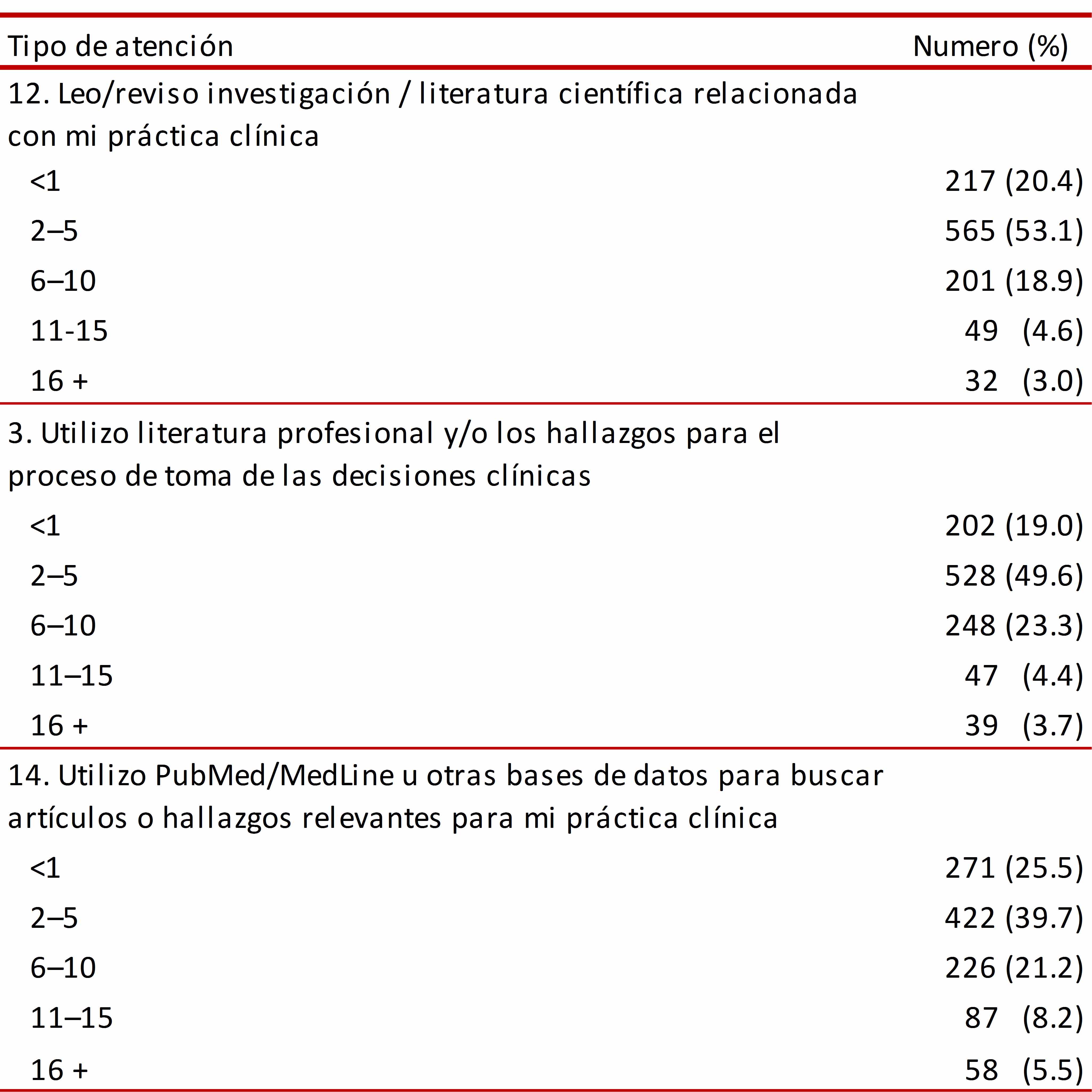 La lectura y revisión de literatura científica como herramienta para la incorporación de la PBE incluyó la lectura mensual de 2-5 artículos para el 53.1% de los encuestados. La toma de decisiones clínicas soportada en la literatura científica y los hallazgos de los mismos, es una práctica que se realiza en el 49.6%. Al indagar por el uso de PubMed/MedLine y otras bases de datos para la búsqueda de artículos o hallazgos relevantes para la práctica, un 39.7% lo realizó de 2-5 veces al mes, mientras que el 5,5% lo hicieron más de 16 veces (Tabla 4).